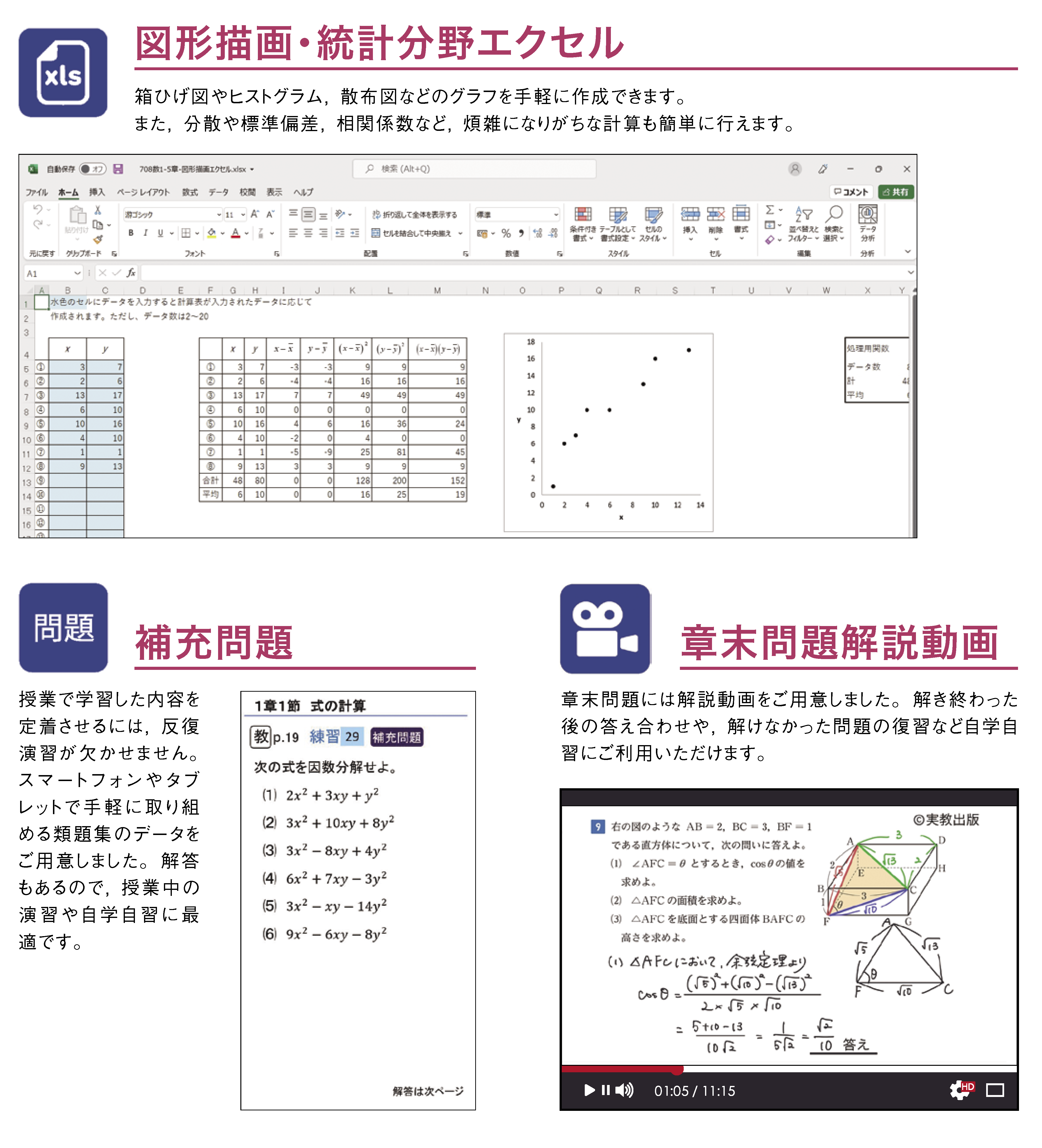 「章末問題B」には解説動画を収録し、得意な生徒の自学自習に最適です。
