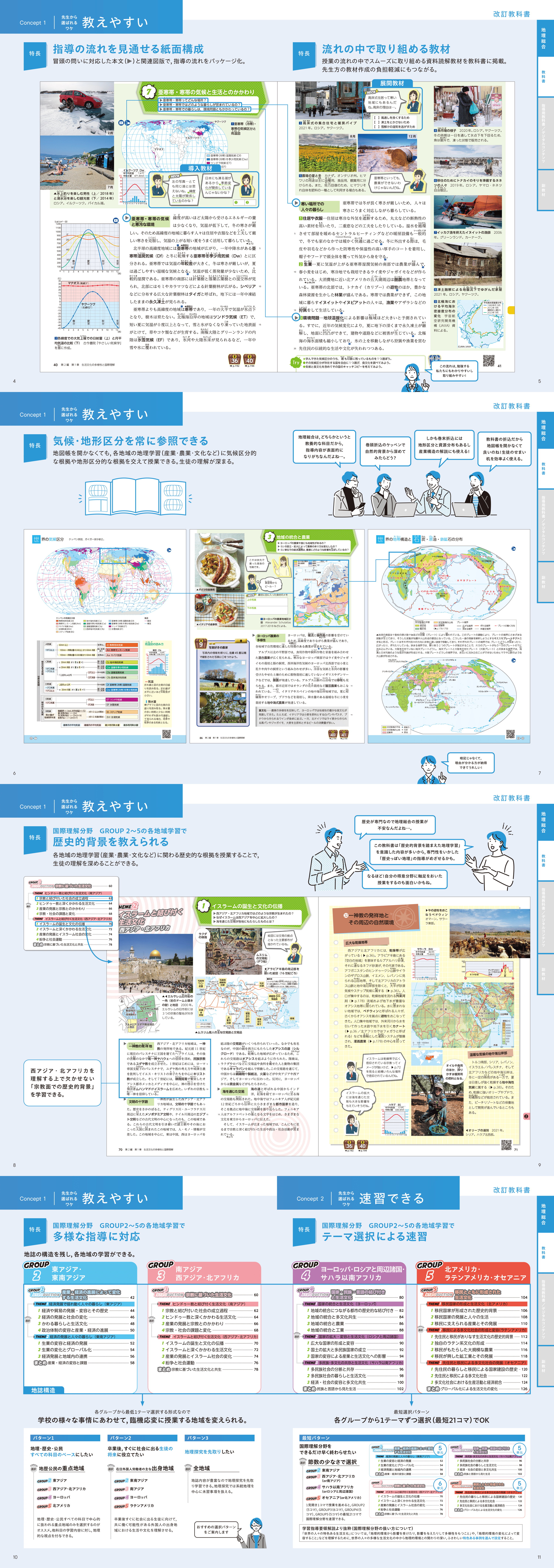 世界の気候区分や地帯 構造を巻頭・巻末折込で常 に参照でき、歴史的背景も教えられるので、生徒の理解を深めることができます。地誌の構造を残し、各地域の学習ができるので多様な指導に対応可能です。
