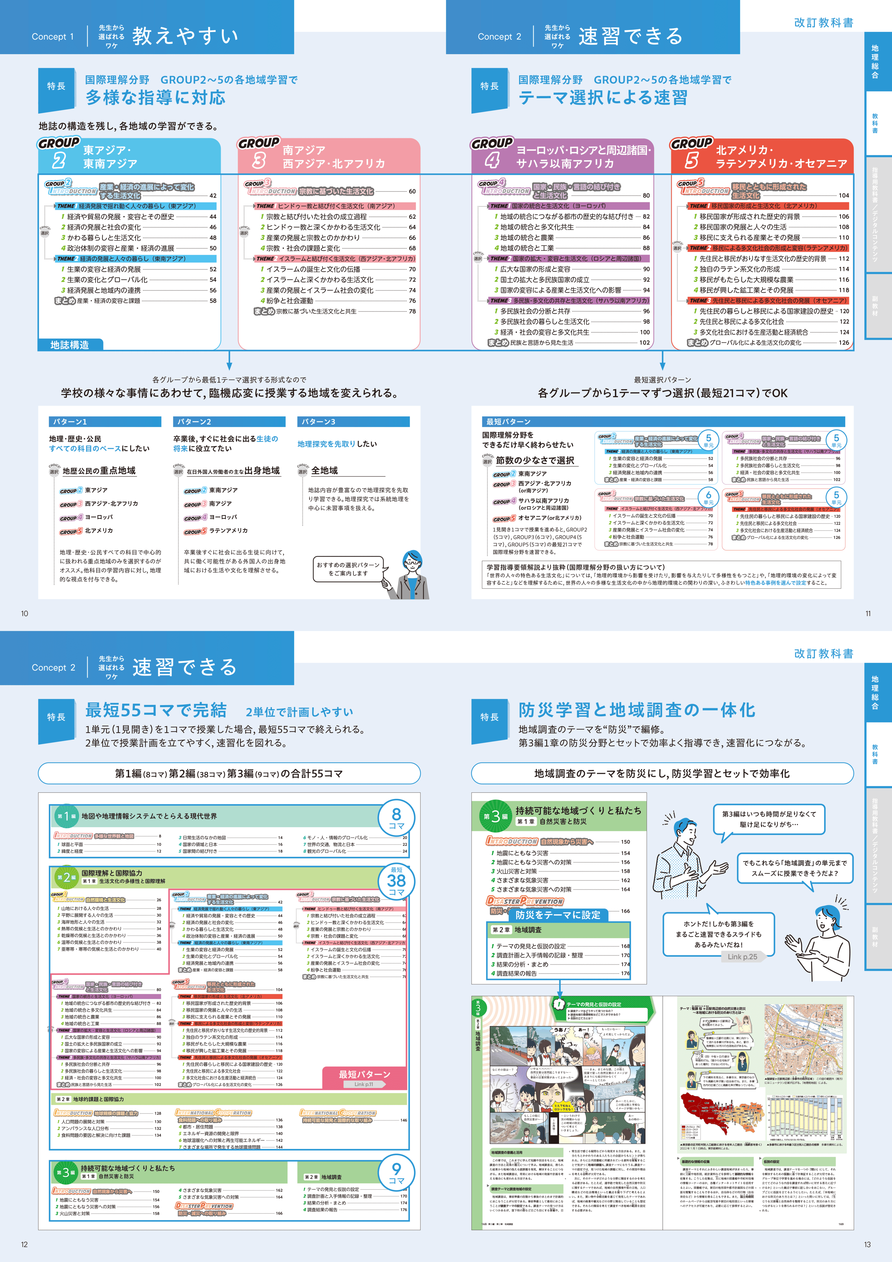 1年間の授業を最短55コマで終えられます。2単位で授業計画を立てやすく、速習化を図れ紙面構成や国際理解分野の地域選択、防災学習やデジタル・ノートでも授業が効率化できます。