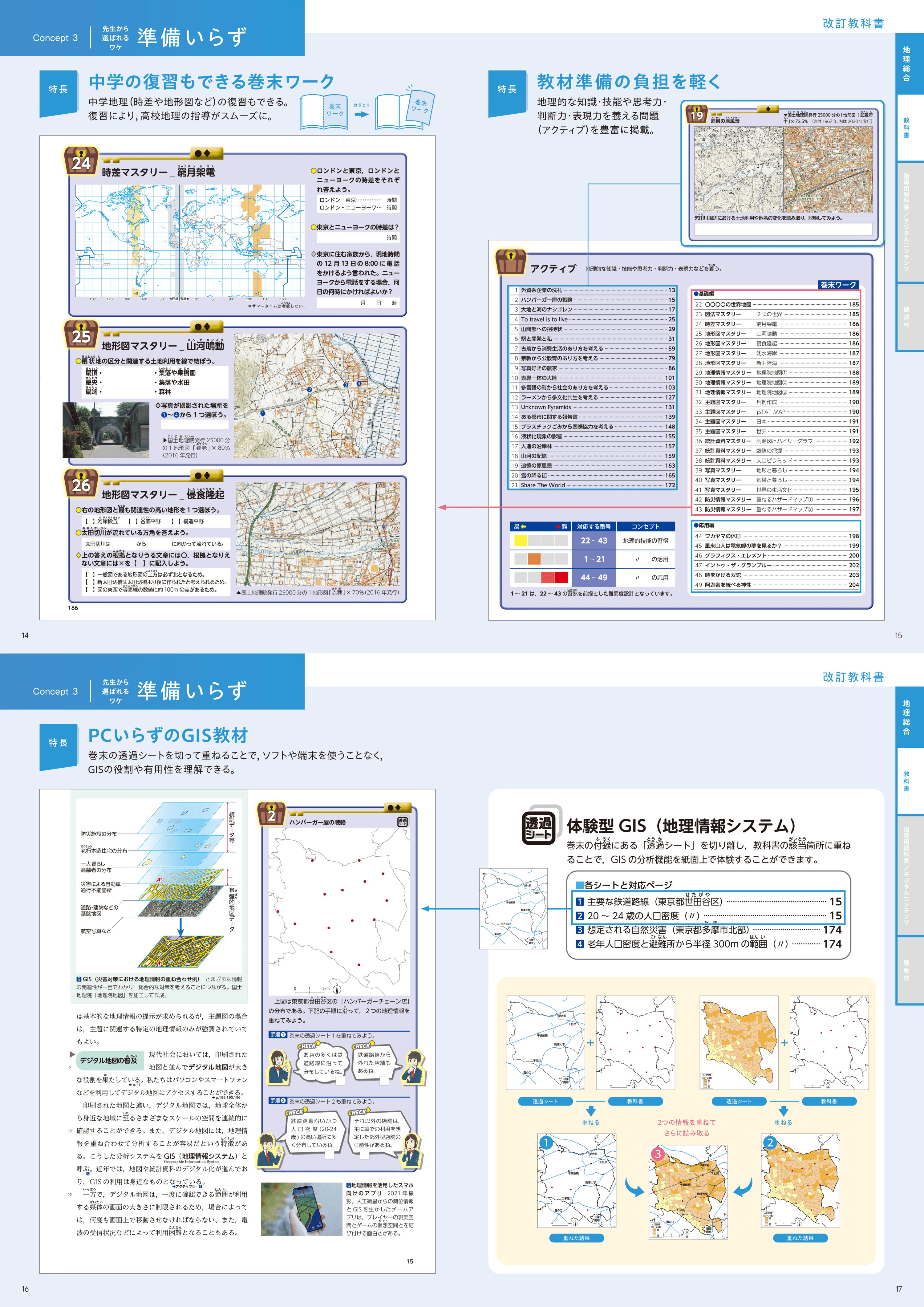 地理的な技能や思考力・判断力・表現力を養える問題(アクティブ)を豊富に掲載。巻末の透過シートを切って重ねると、ソフトや端末を使わず、GISを手軽に実習できます。