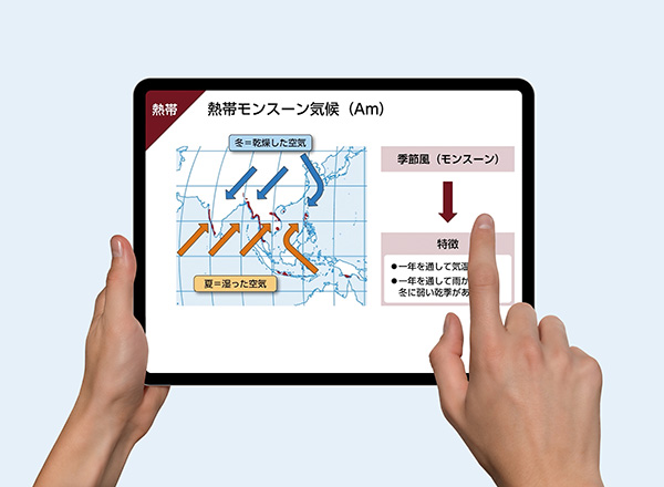 「視覚化」が生徒の理解度向上に直結する分野(気候区分など)をアニメーション化しました。