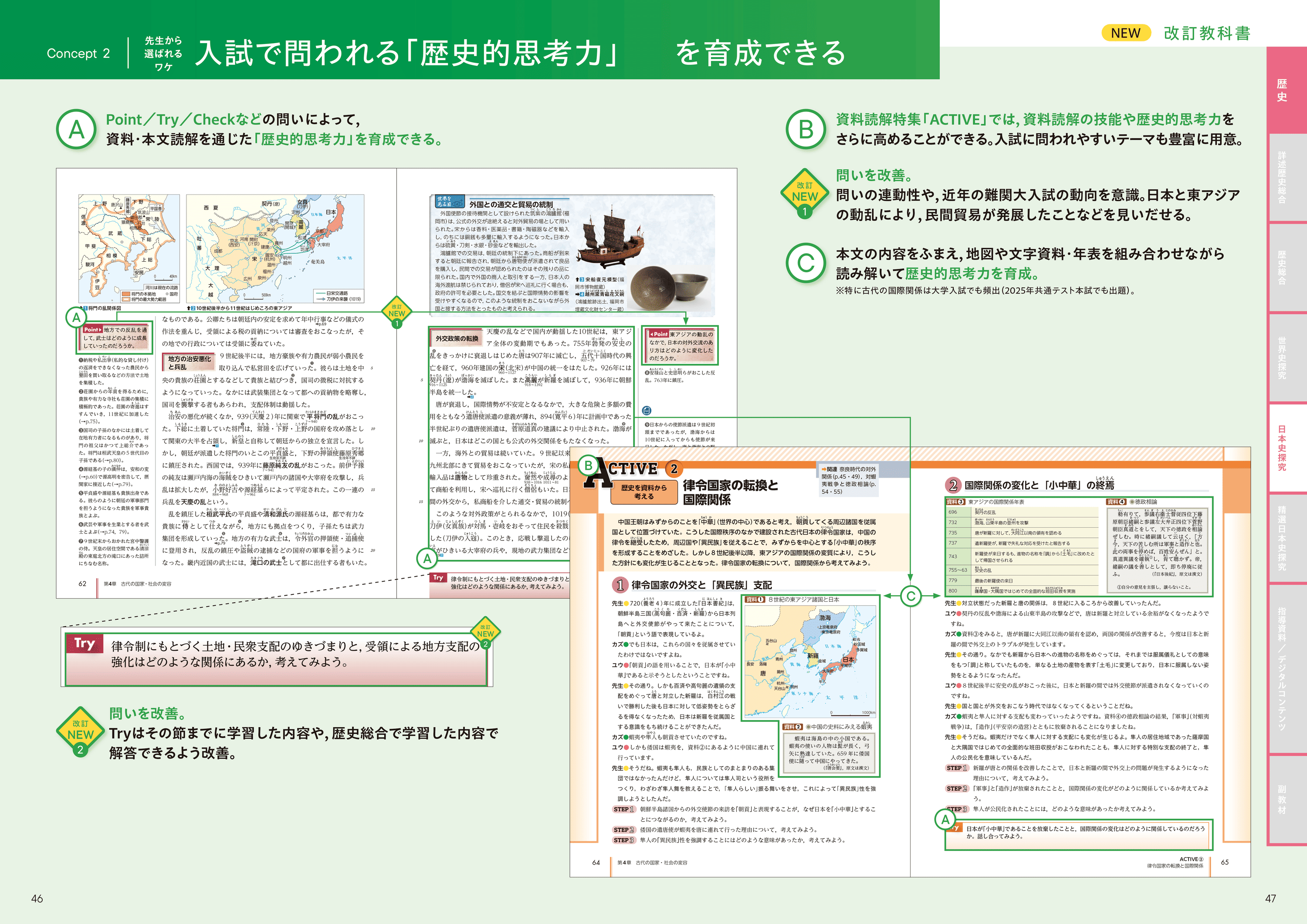 Check/Try/Pointなどの問いによって、資料・本文読解を通じた「歴史的思考力」を育成できる。資料読解特集「ACTIVE」で、「歴史総合」で身につけた資料読解の技能や歴史的思考力をさらに高めることができる。
