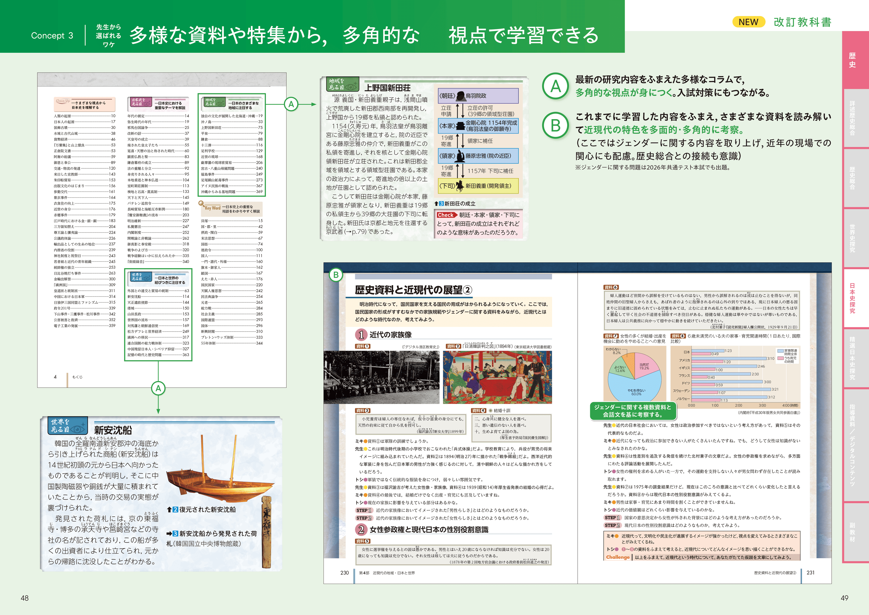 コラムや読解資料を多角的な視点から掲載。一面的な理解だけでなく、多角的な視点から歴史を捉えることができる。
