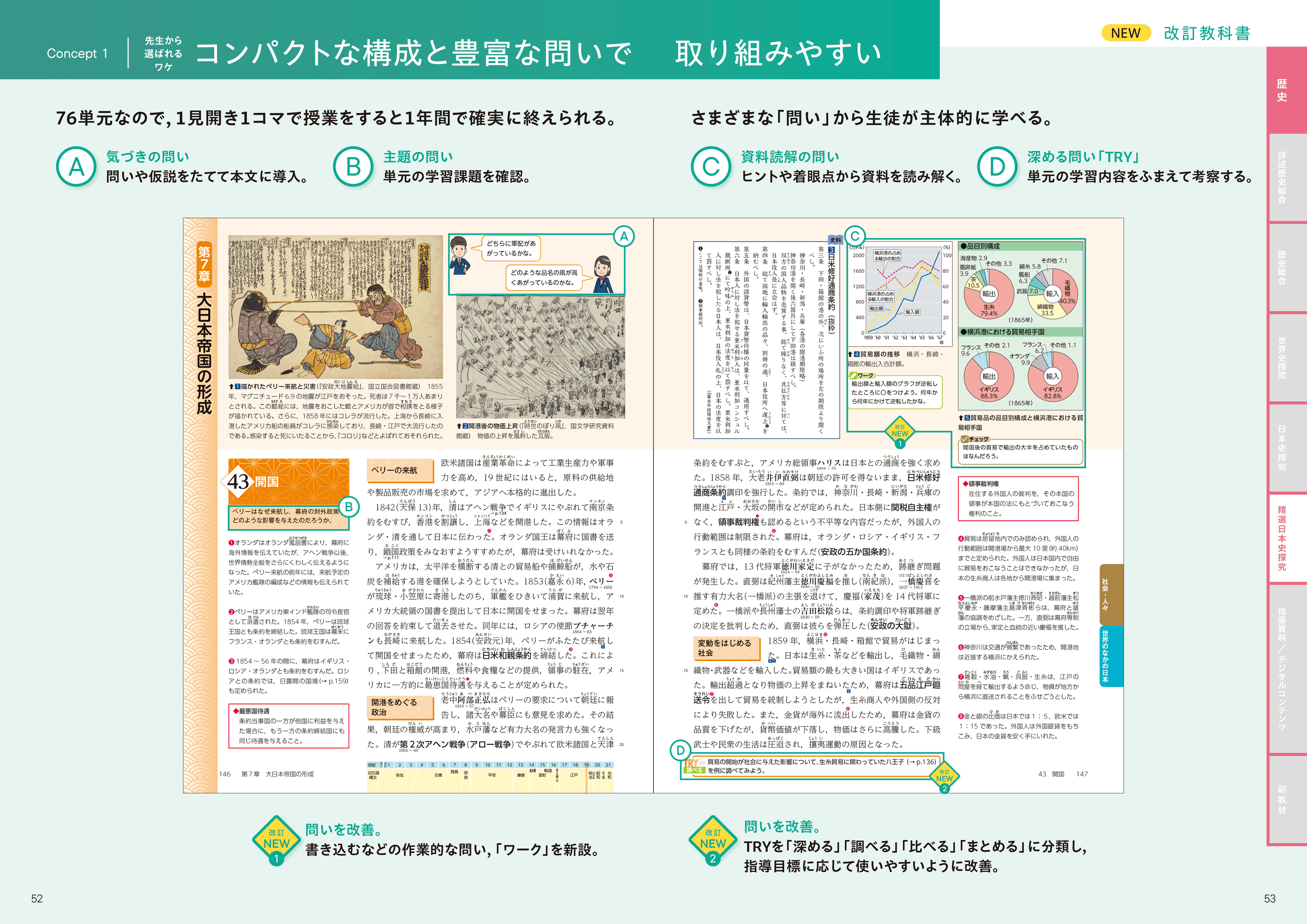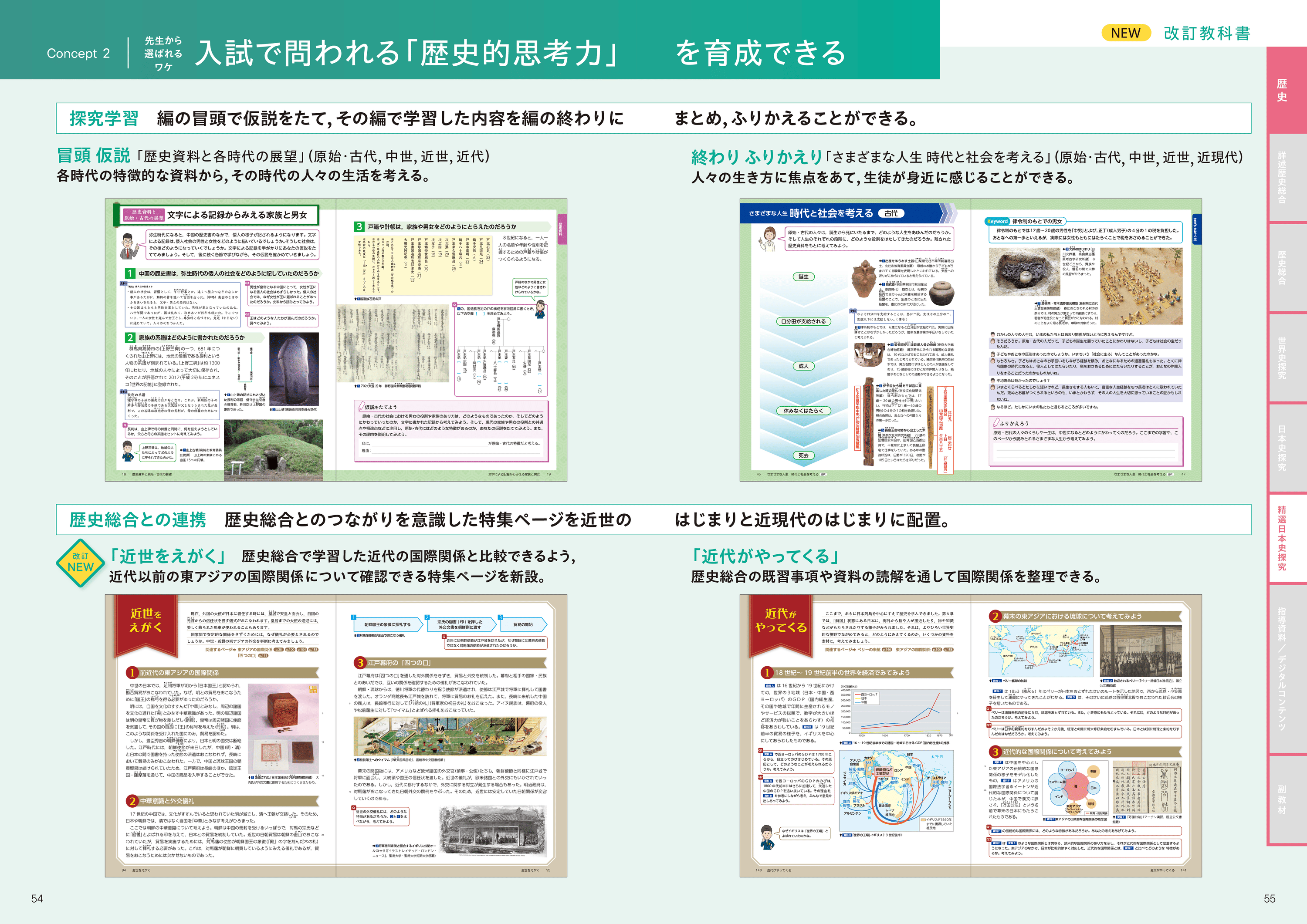 編の冒頭で仮説をたて、その編で学習した内容を編の終わりにまとめ、ふりかえることができる特集ページや、近世のはじまりと近現代のはじまりに、歴史総合とのつながりを意識した特集ページを掲載。
