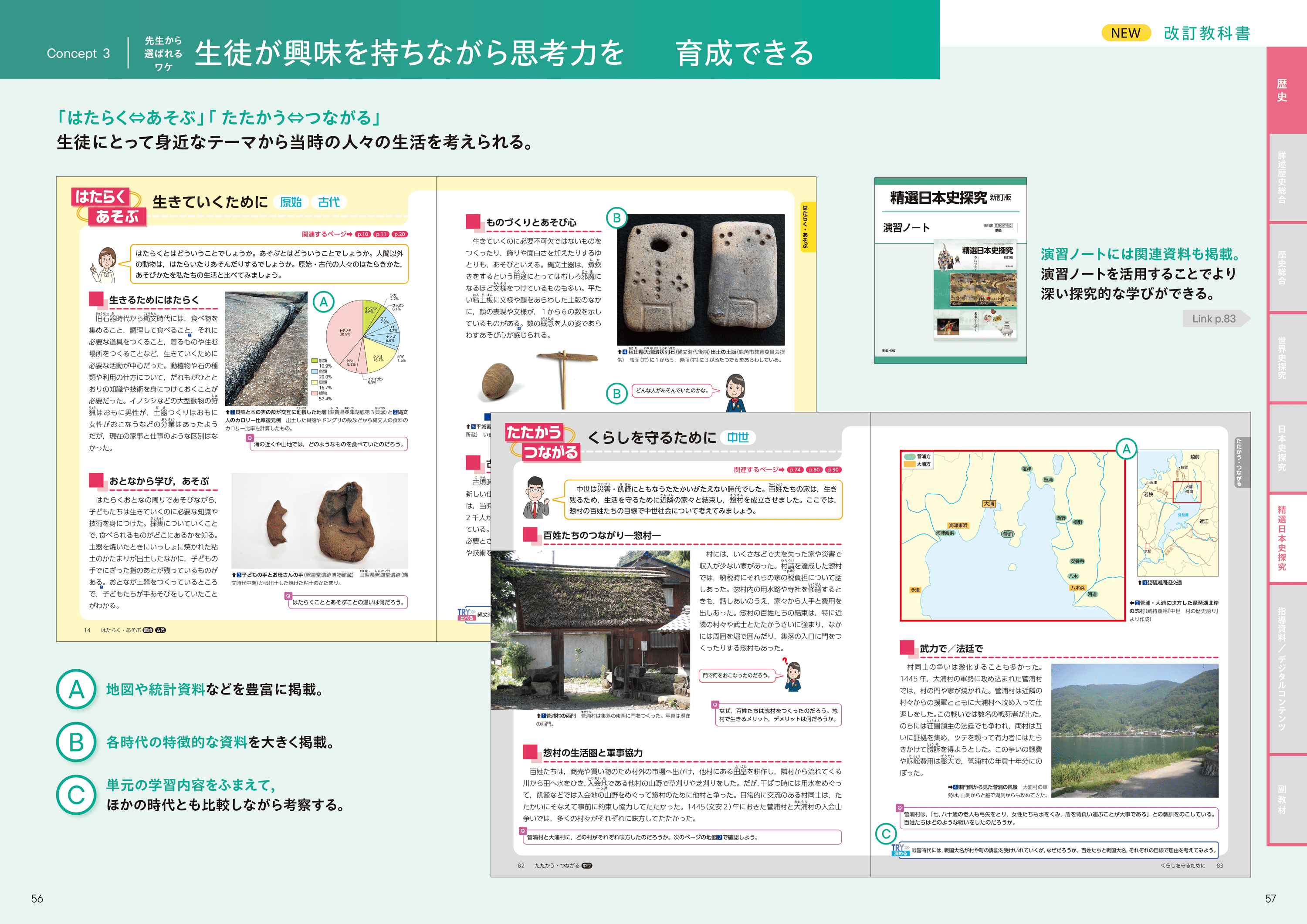 歴史を身近に感じることができるような「はたらく⇔あそぶ」「たたかう⇔つながる」 「歴史のなかの動物」などを設定し、興味・関心を喚起しながら思考力を養えるページを設置