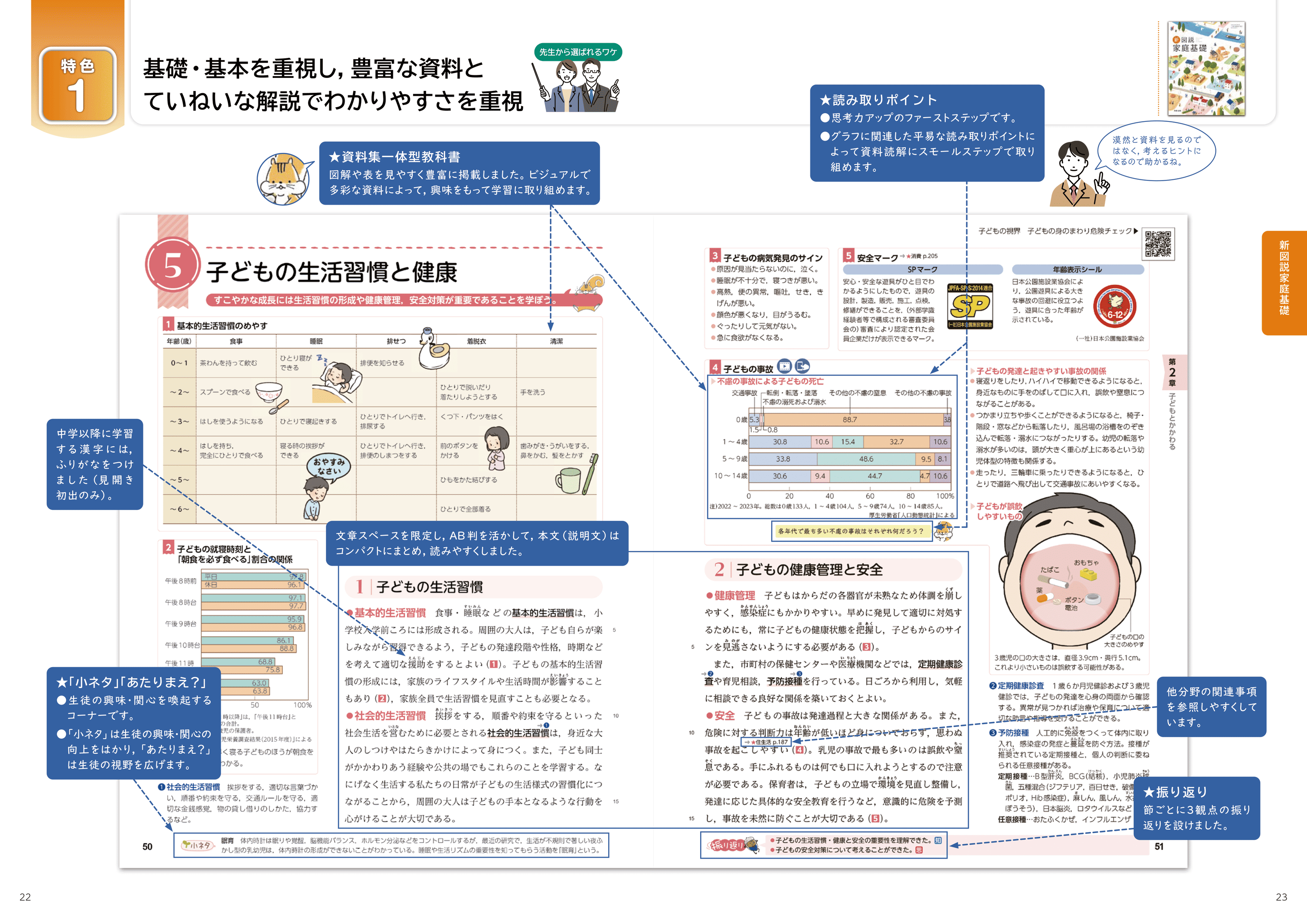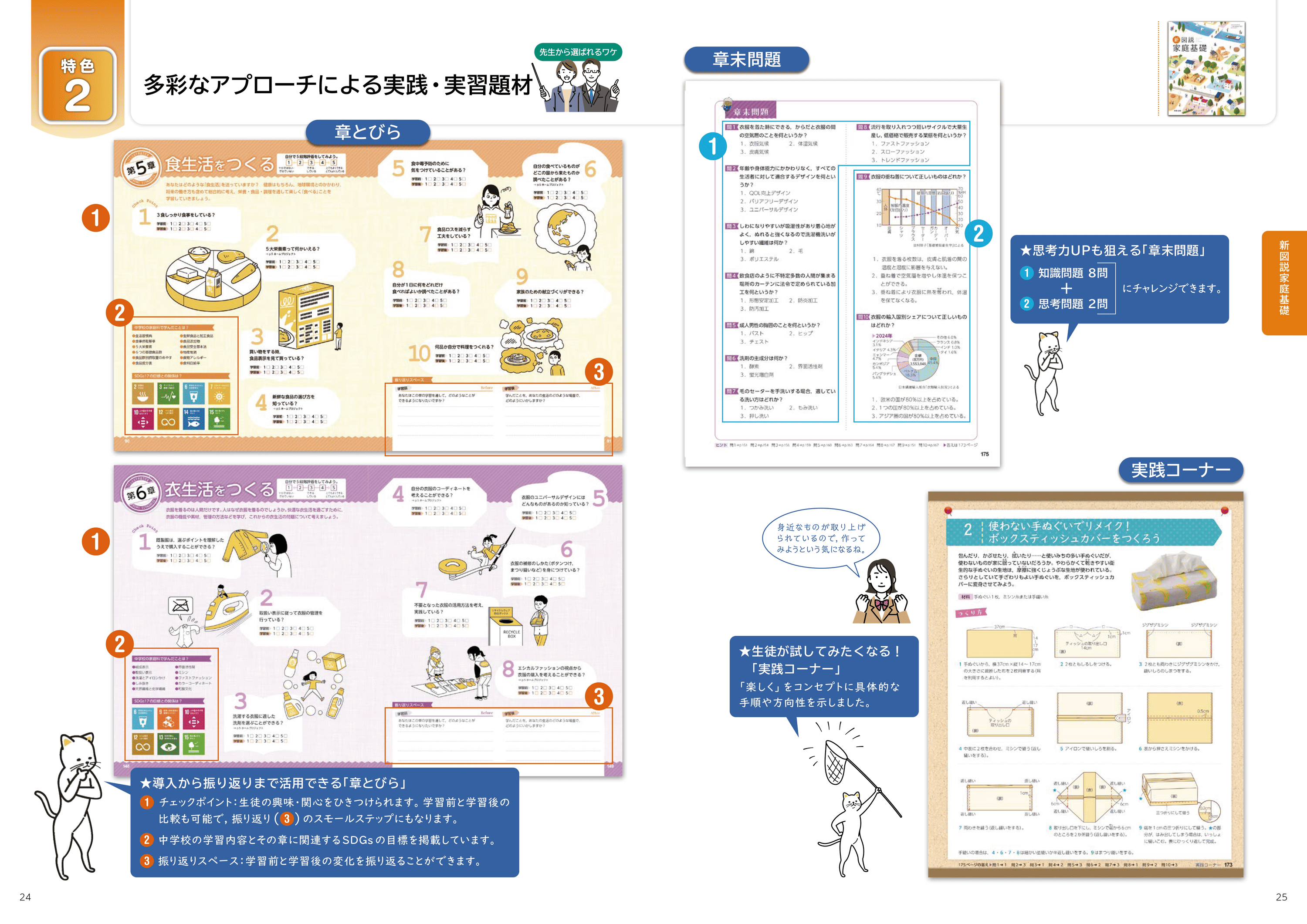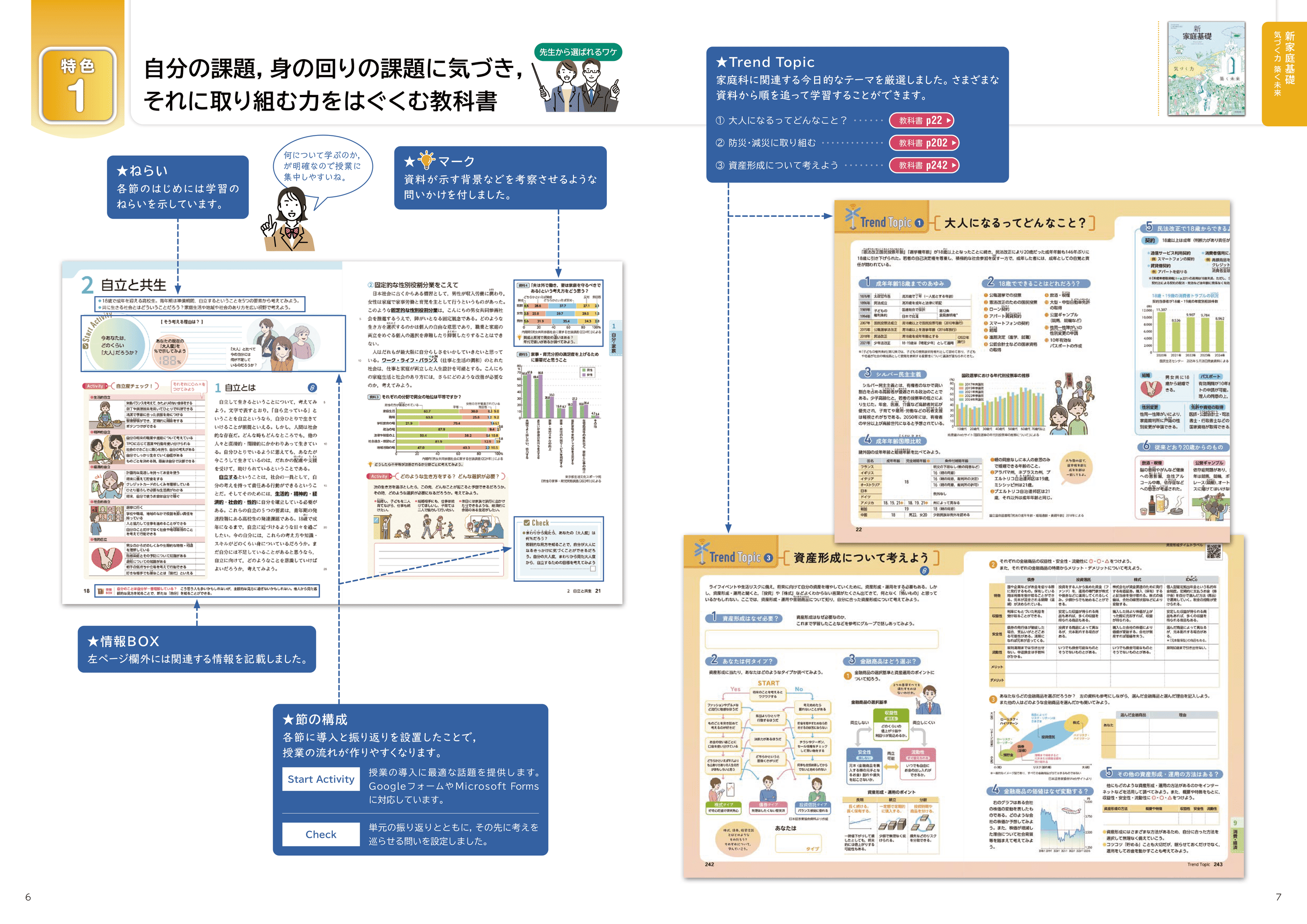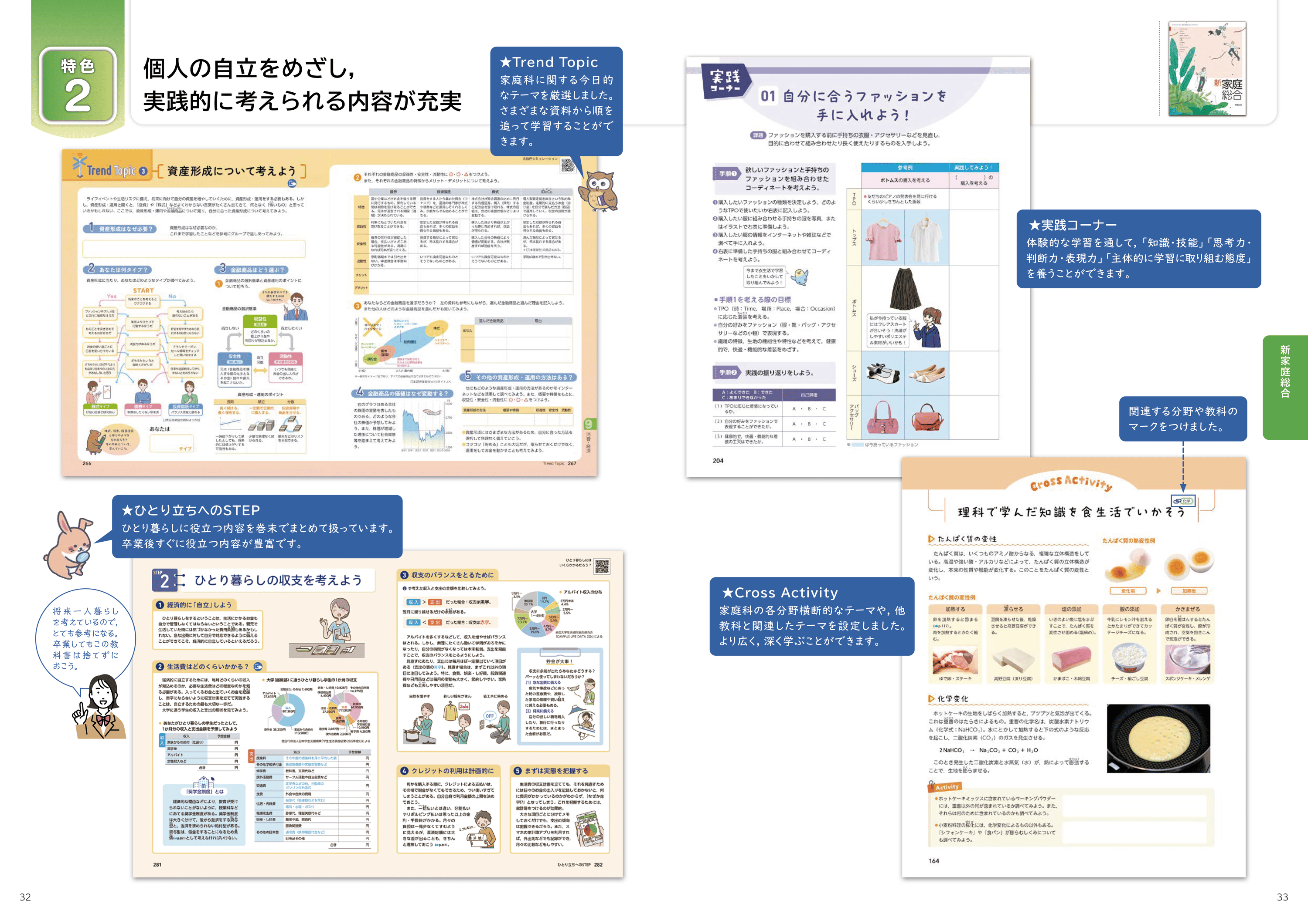 実践的に考えられる内容が充実①Trend Topic:今日的なテーマを特設。順を追って学習でき、授業で扱いやすい構成です。②ひとり立ちへのSTEP:ひとり暮らしに必要な内容を巻末にまとめました。卒業後すぐに役立つ内容が豊富です。