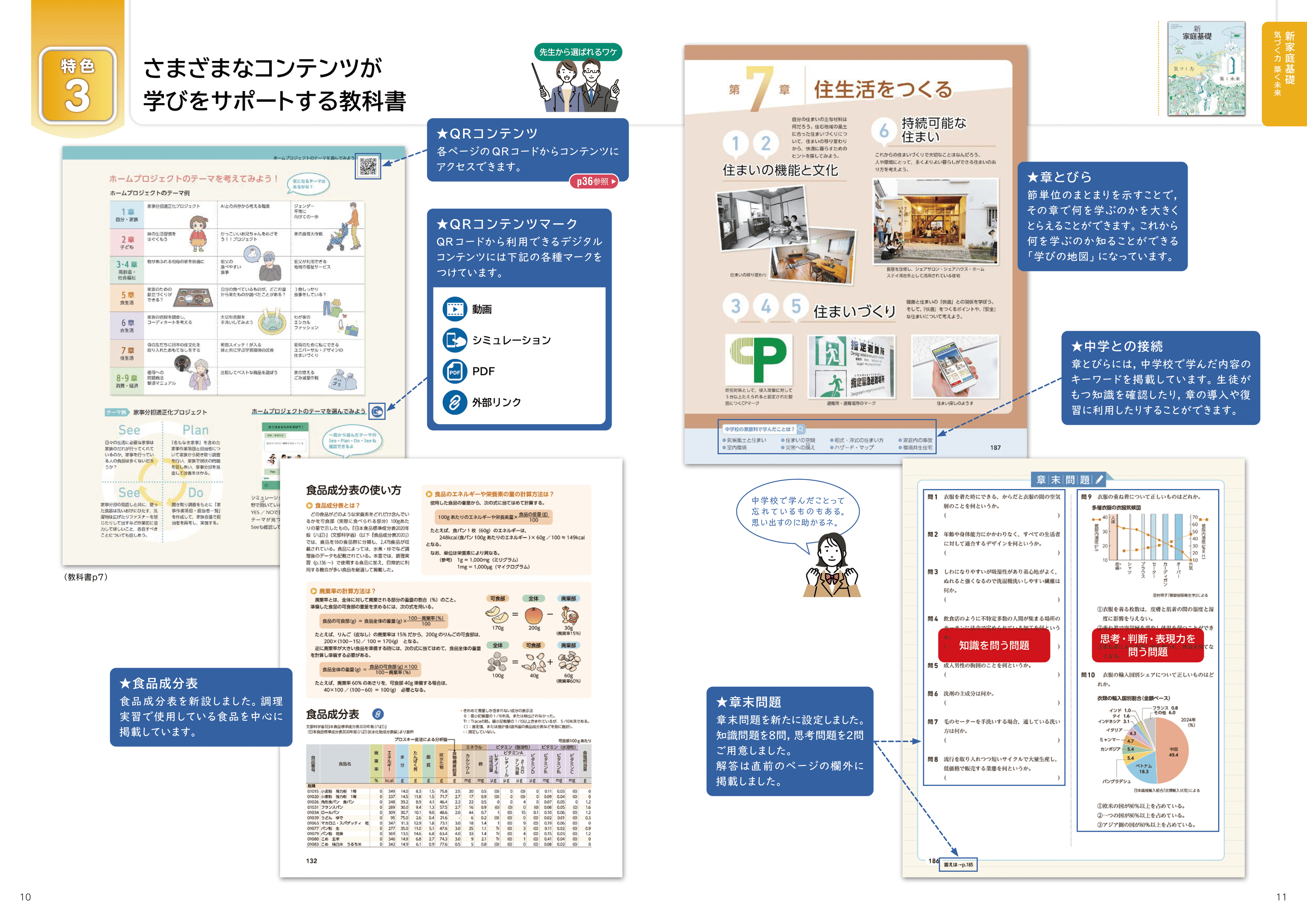 ①QRコンテンツ:動画に加え、シミュレーションアプリや外部リンクを追加。②食分野:新たに食品成分表を掲載。③章とびら:中学で学んだ内容を確認できるキーワードを掲載。④章末問題:学習内容の確認ができます。⑤資料の読み取りポイント、分野・教科横断マークも掲載。