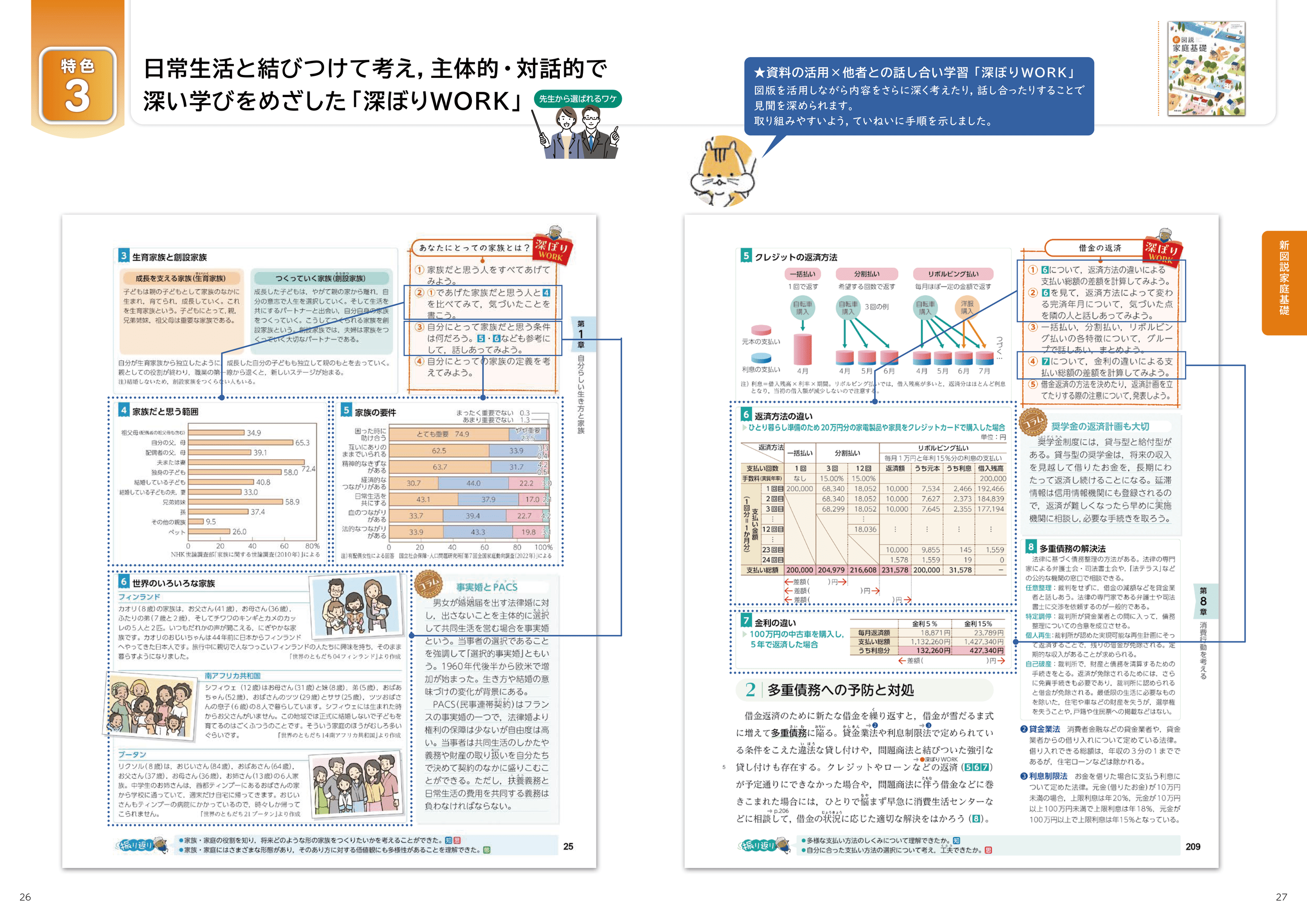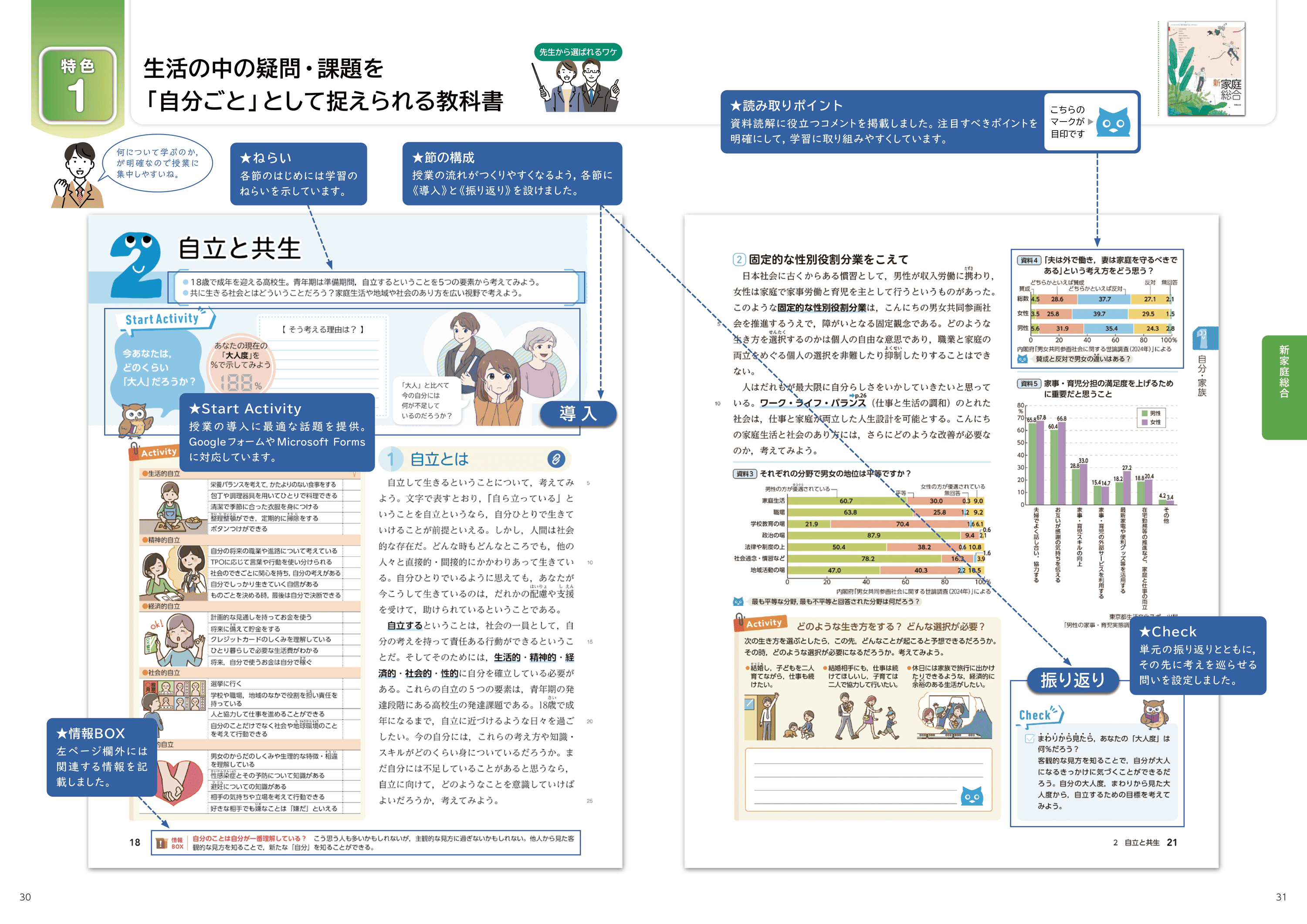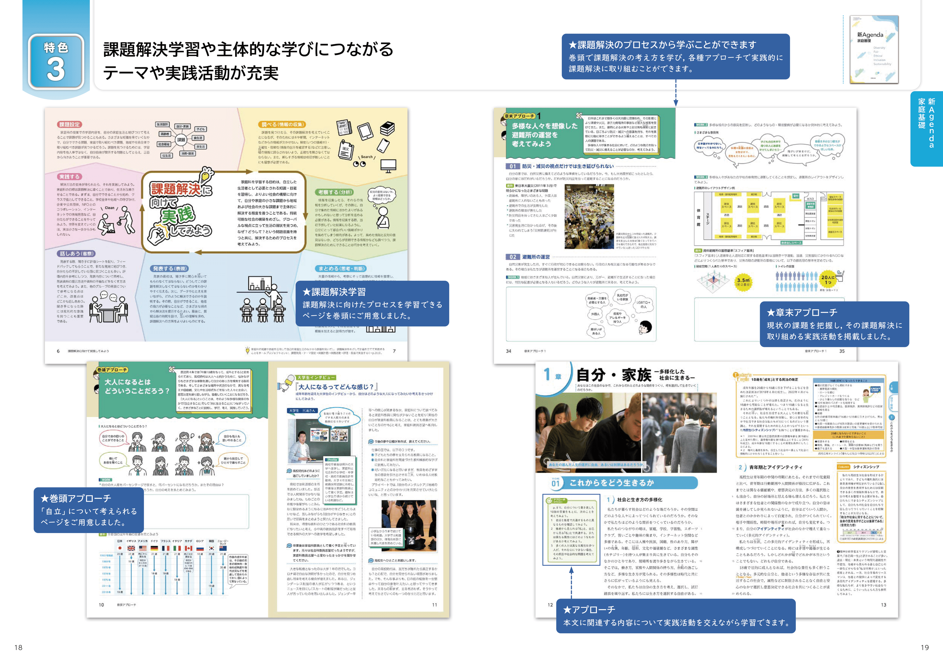①巻頭アプローチ・章末アプローチを新設:「自立」「避難生活」「世帯・世代間交流」「資産形成」について、課題と事例から実践活動に取り組めます。②本文では、随所に「アプローチ」を設け、考えをまとめる、話し合う、調べる、体験するなど、多岐にわたった手法で展開しました。