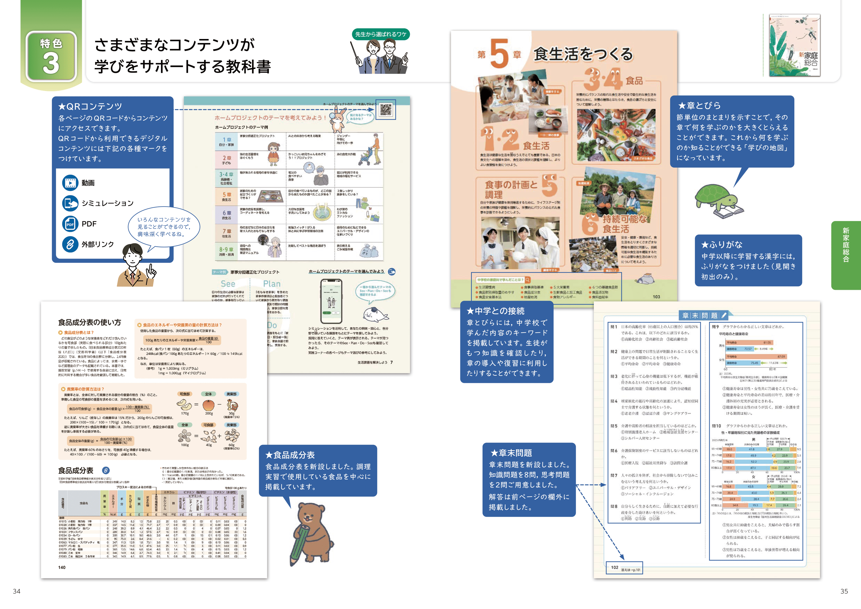 学びをサポートする教科書①QRコンテンツ:動画に加え、シミュレーションアプリや外部リンクを追加。②食分野:新たに食品成分表を掲載。③章とびら:中学で学んだ内容を確認できるキーワードを掲載。④章末問題:学習内容の確認ができます。