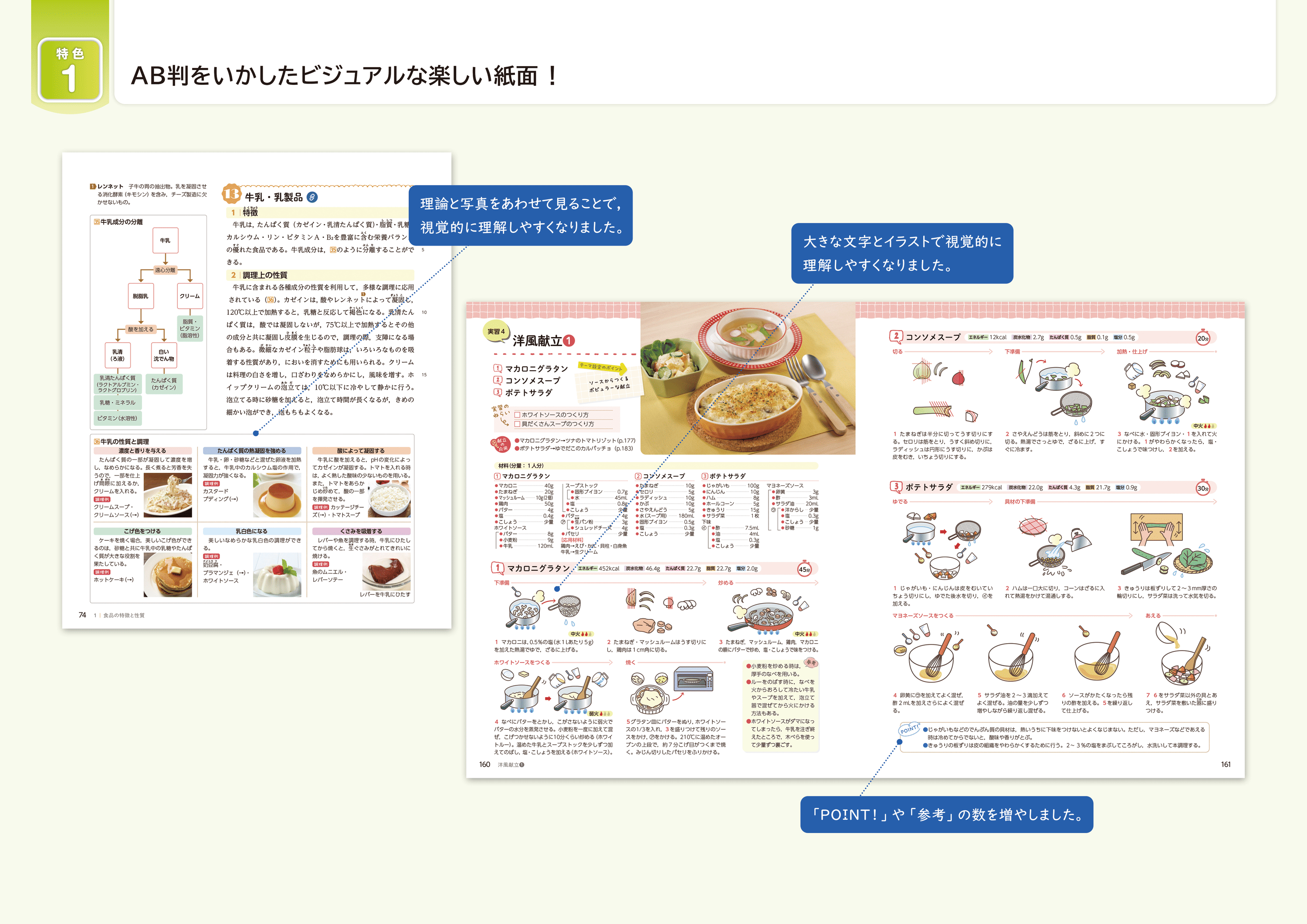 ①座学分野では、理論と写真をあわせて見ることで、視覚的に理解しやすくしました。②調理実習では、大きな文字とイラストで視覚的に理解できます。