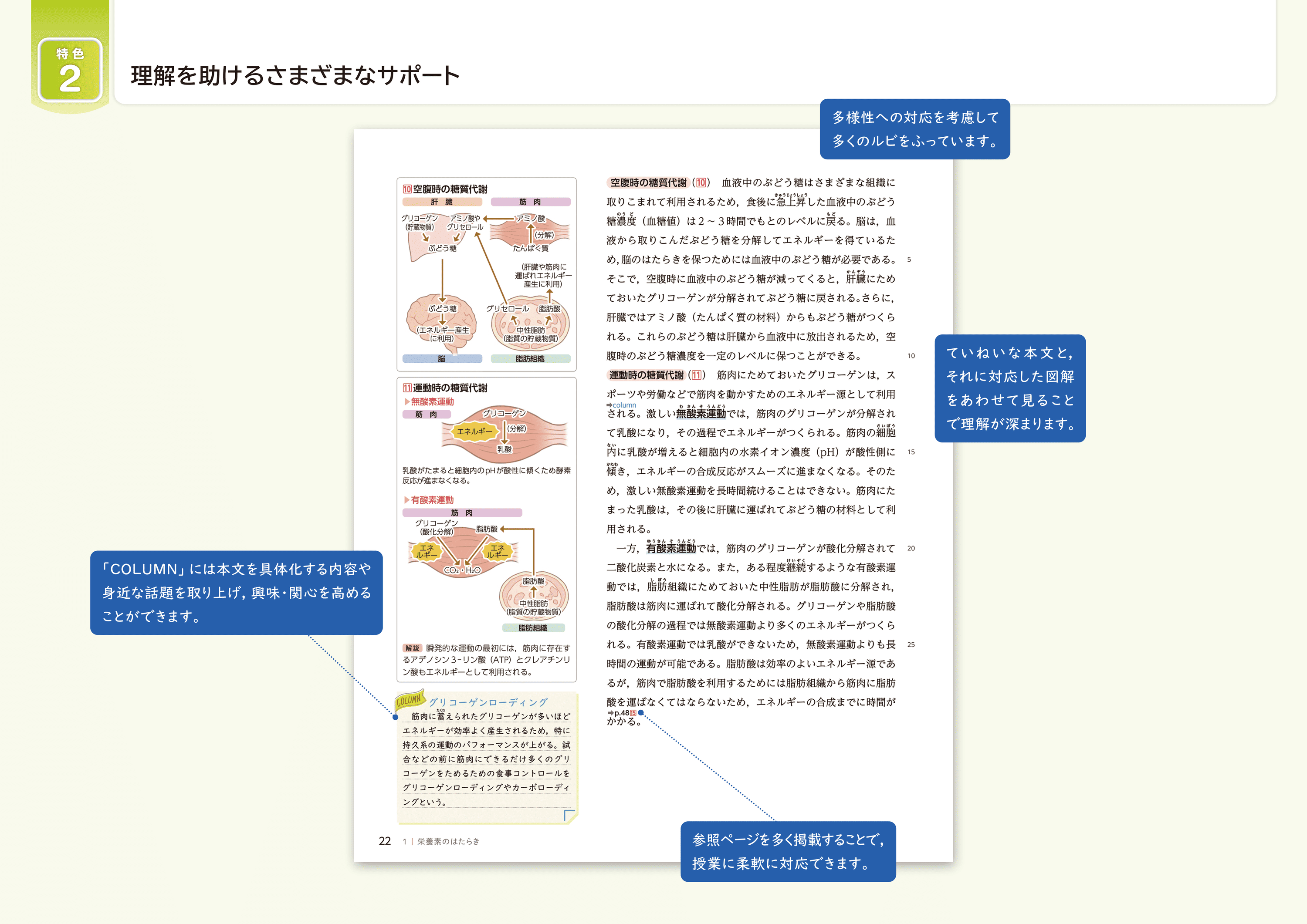 ①ていねいな本文と、それに対応した図解をあわせて見ることで理解が深まります。②本文を具体化する内容や身近な話題を取り上げる「COLUMN」や、多様性への対応を考慮した多くのルビ、参照ページをご用意しております。