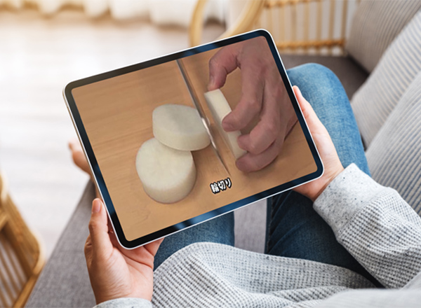 職業インタビュー動画や、基本の切り方、飾り切り、味やいかの下処理、だしのとり方、ポリ袋炊飯の動画を見ることができます。