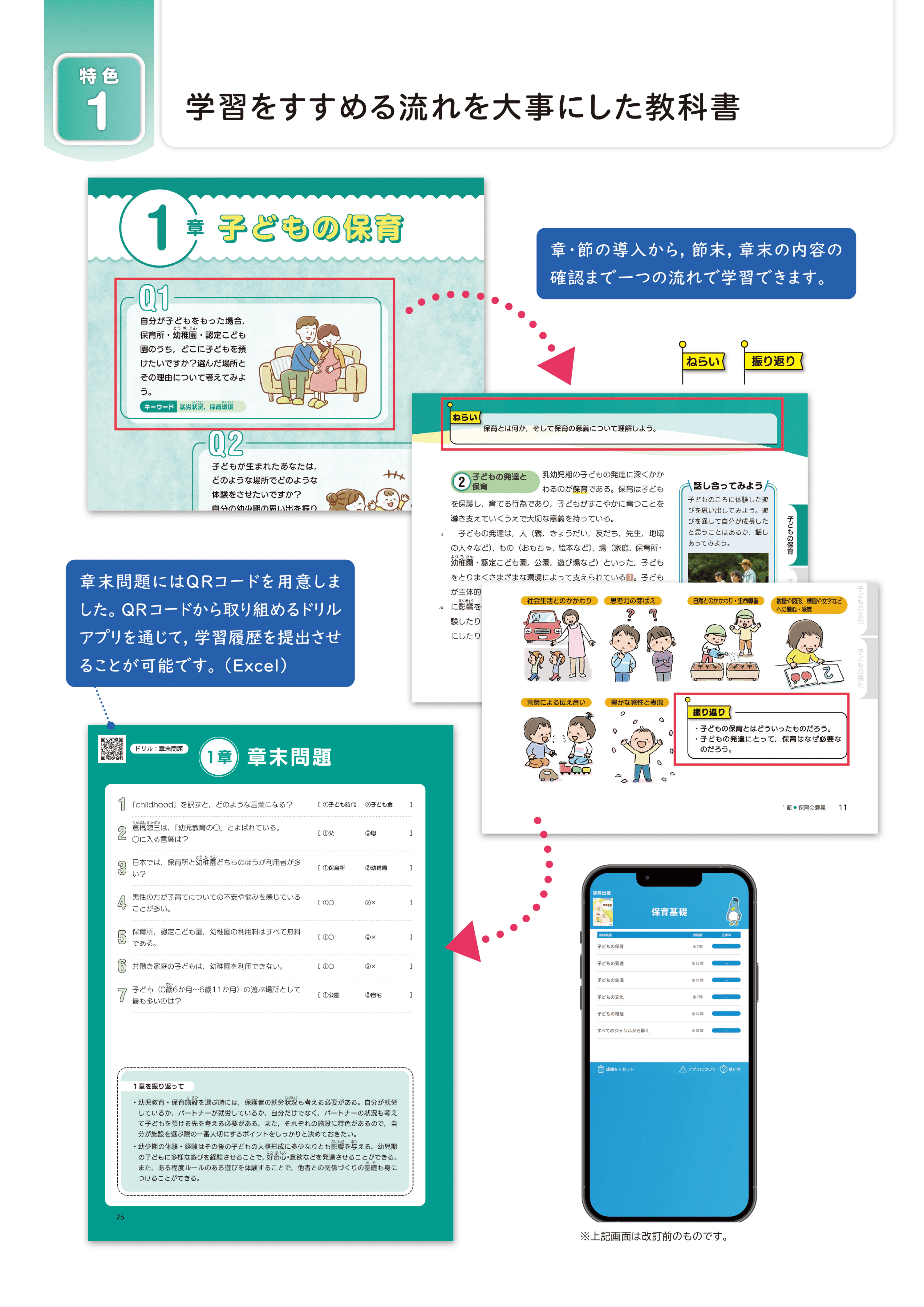 新設した章とびら、各節のねらい・ふり返り、章末問題で各章の導入から学習内容の確認までできるようにしました。