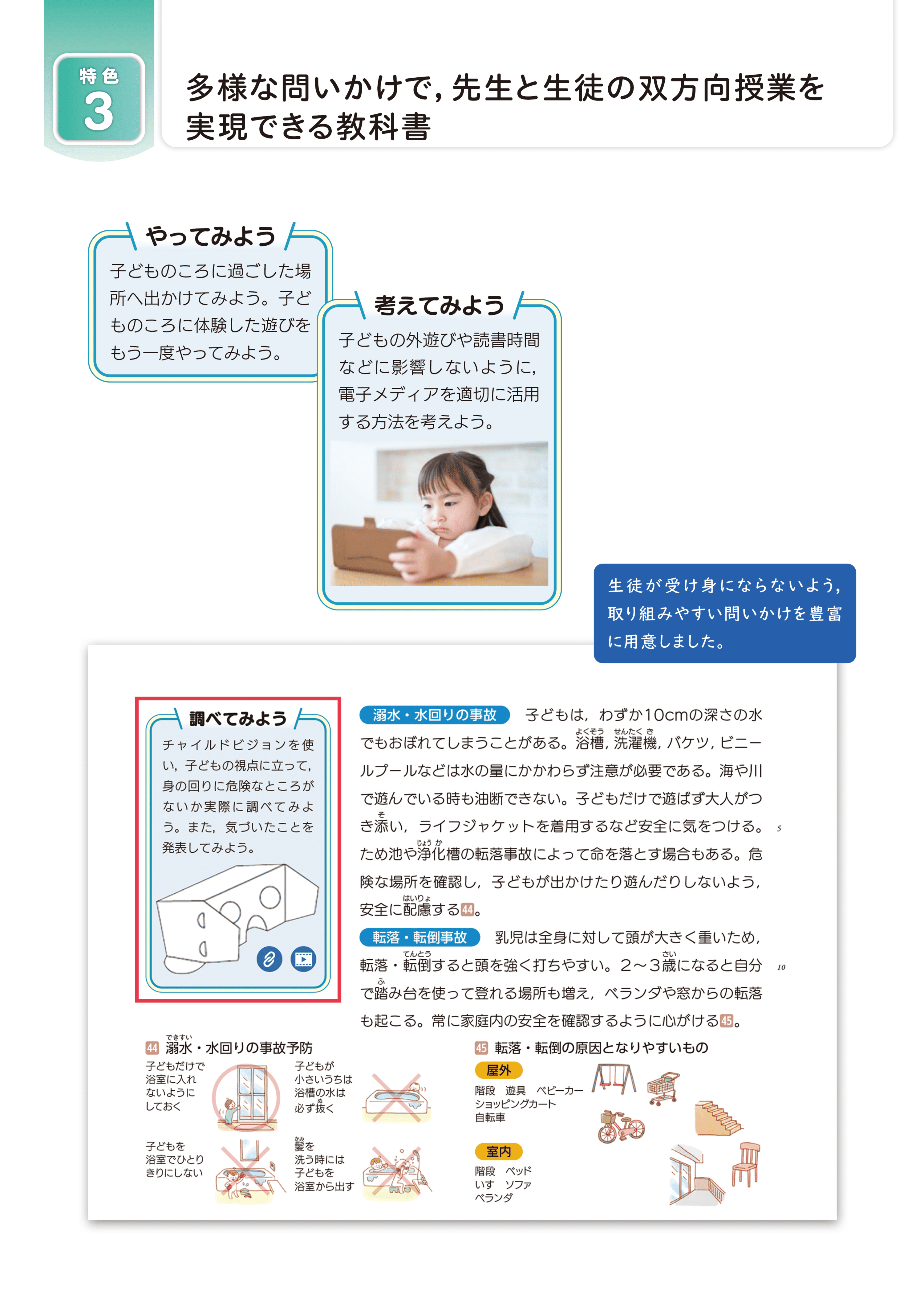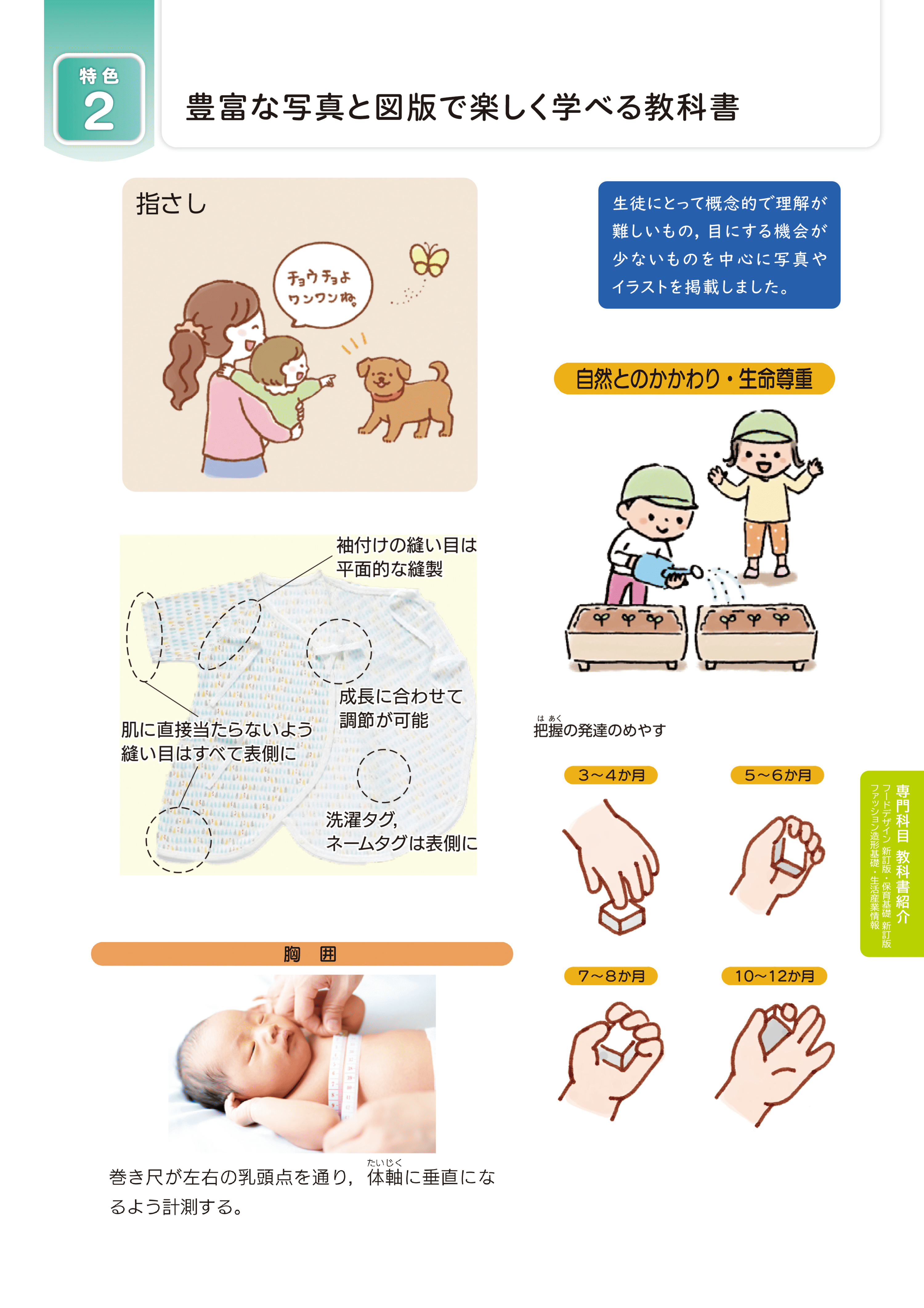楽しく学べる特集ページ(代表的な子どもの病気の症状とそのケア・子供の遊びを予測しよう・子どもの遊びに参加しよう等)をご用意しました。検定に役立つ実習題材も充実しています。