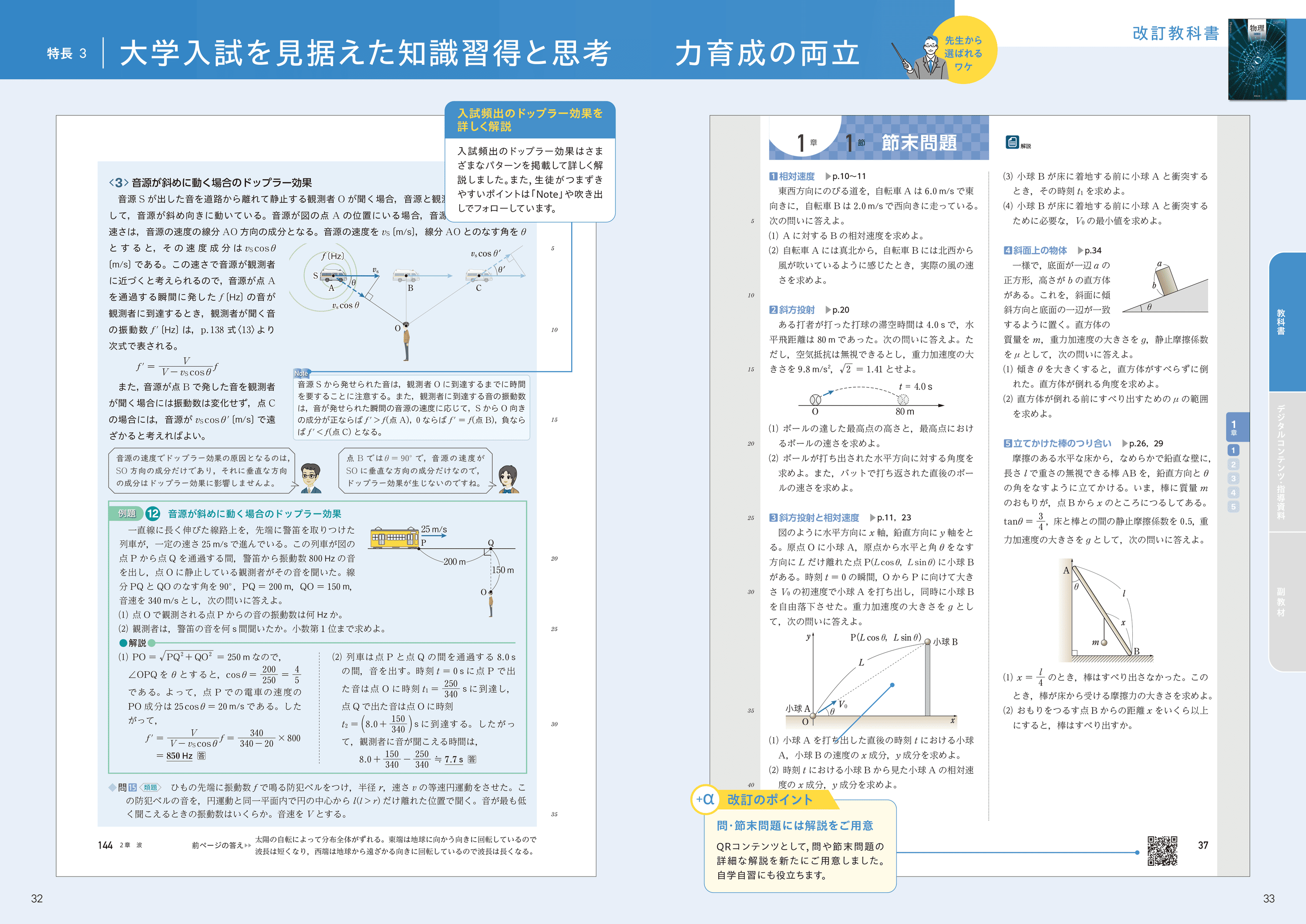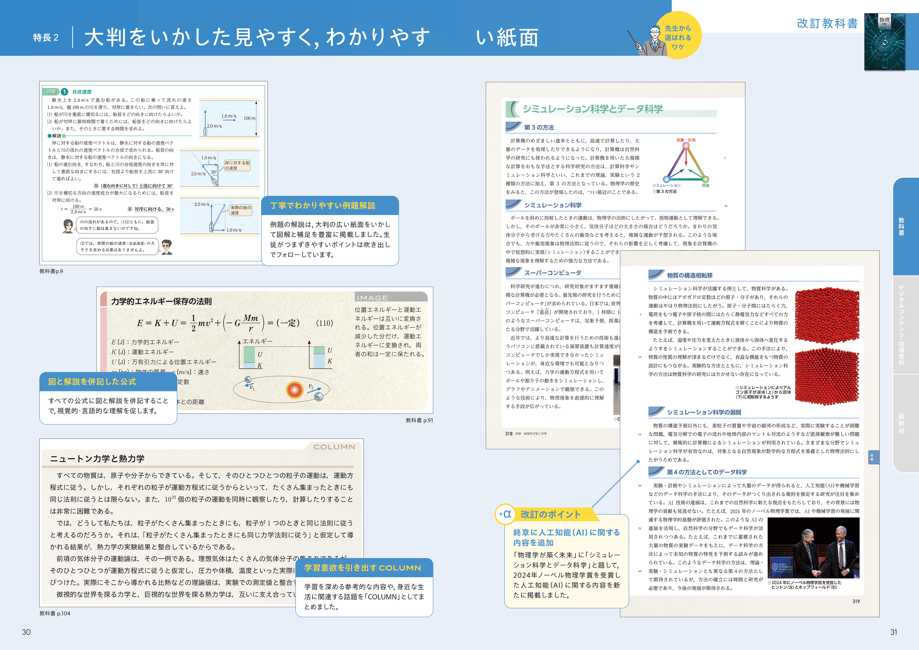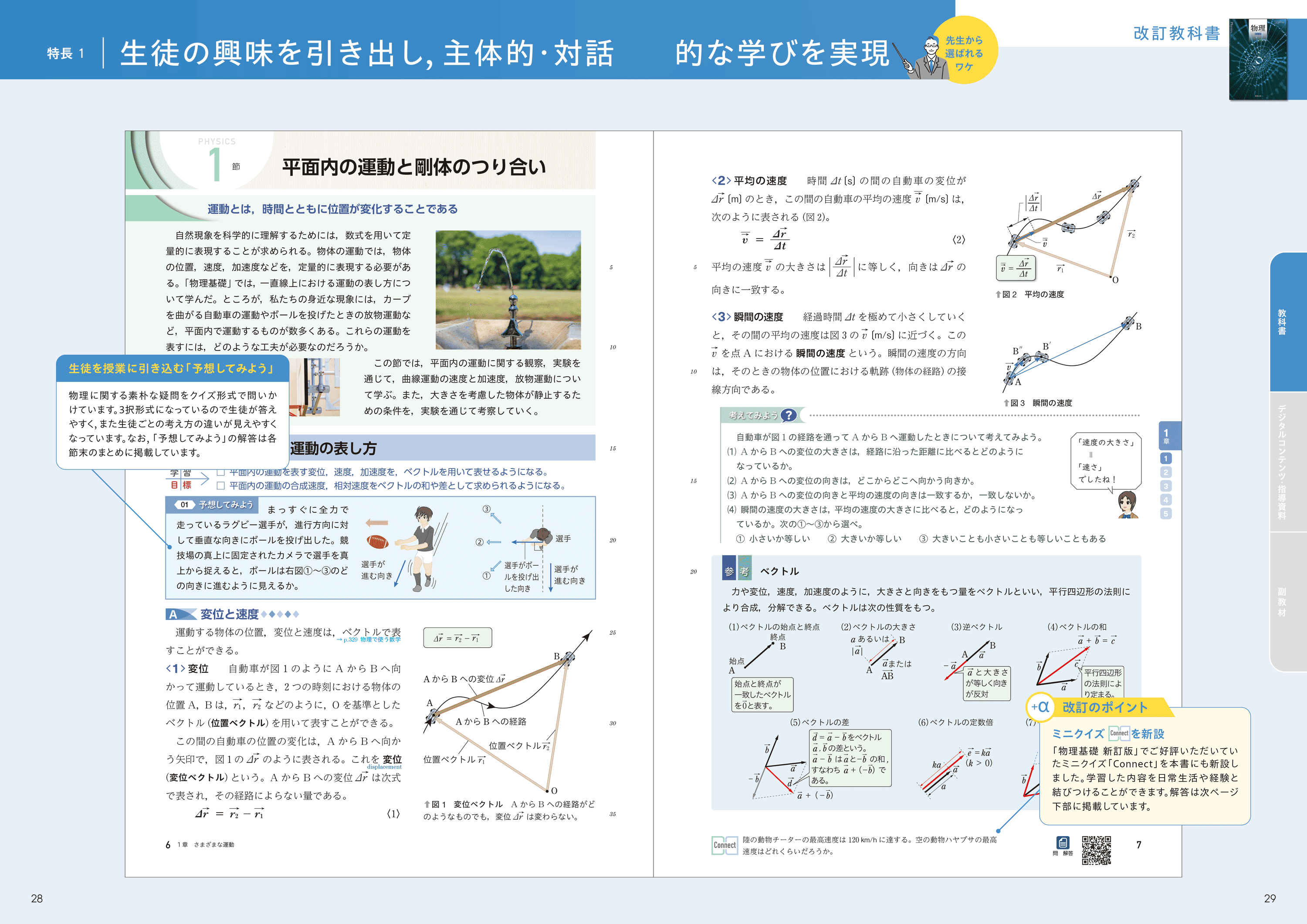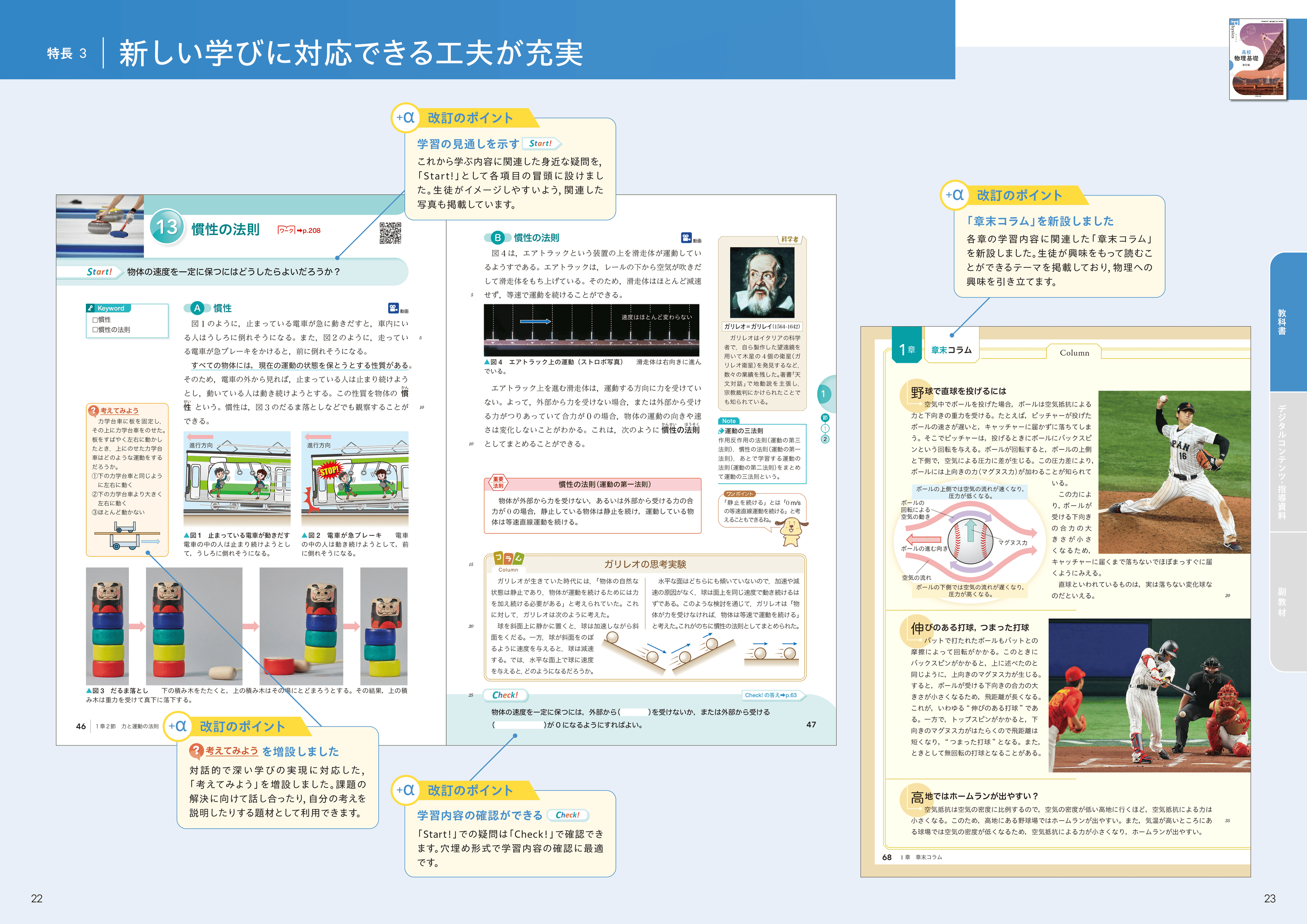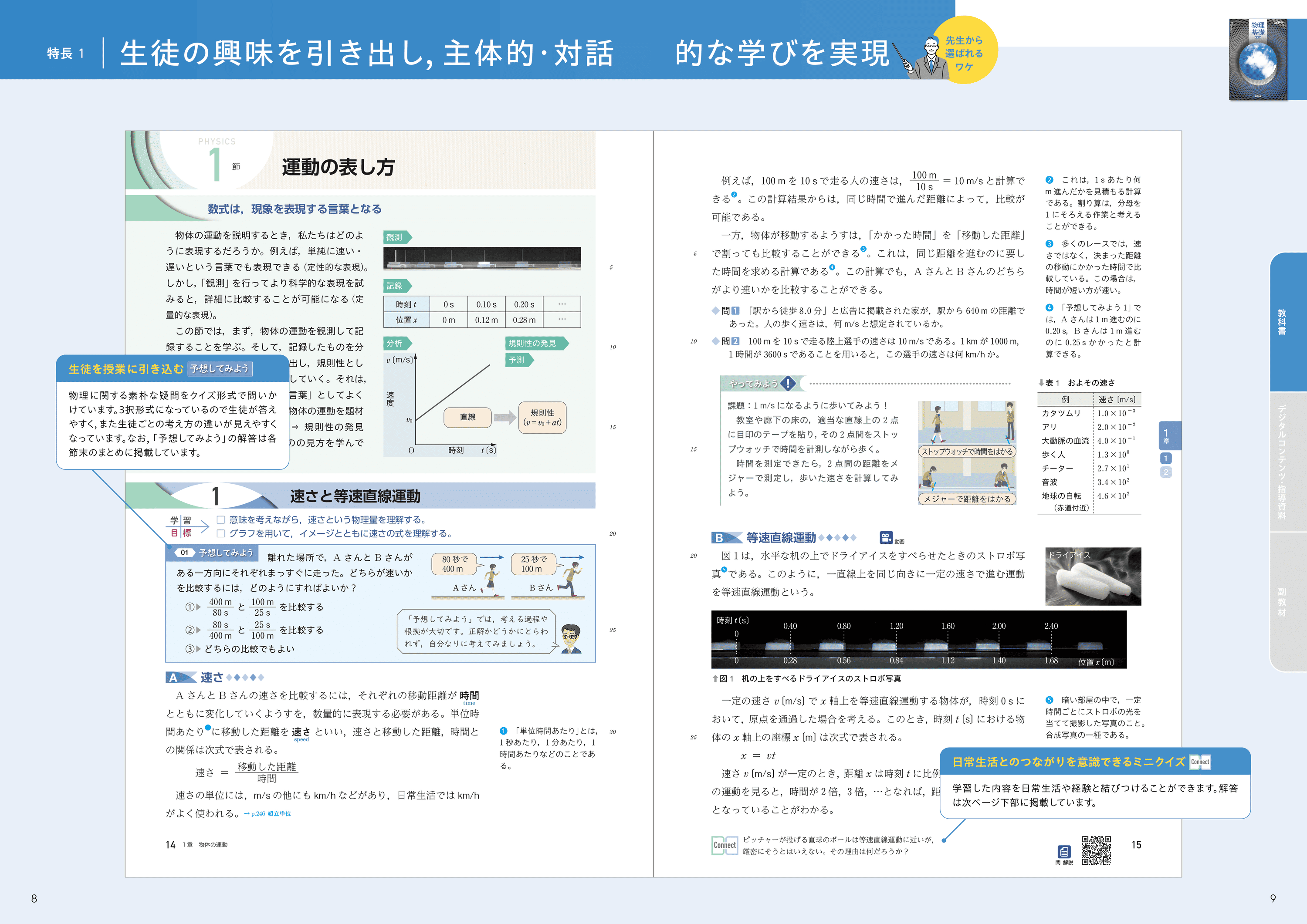 各節冒頭の「予想してみよう」では、物理に関する素朴な疑問をクイズ形式で提示することで、生徒を授業に引き込みます。また、随所に設けたコラムが生徒の興味・関心を引き出します。
