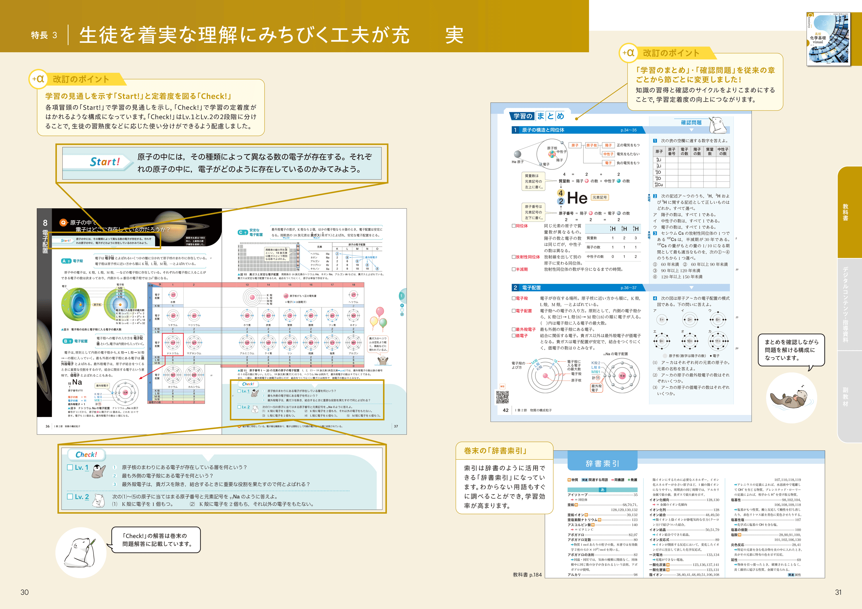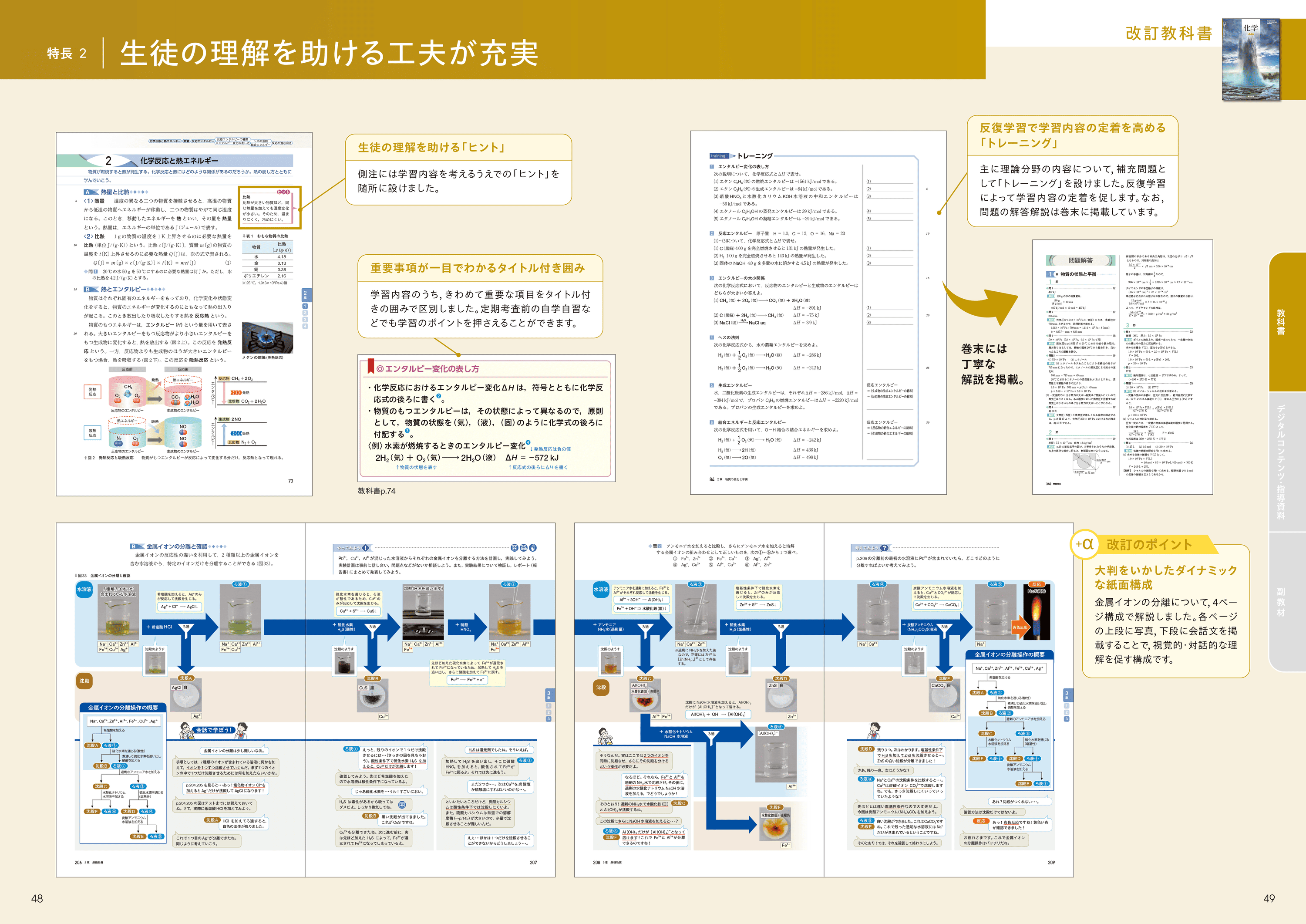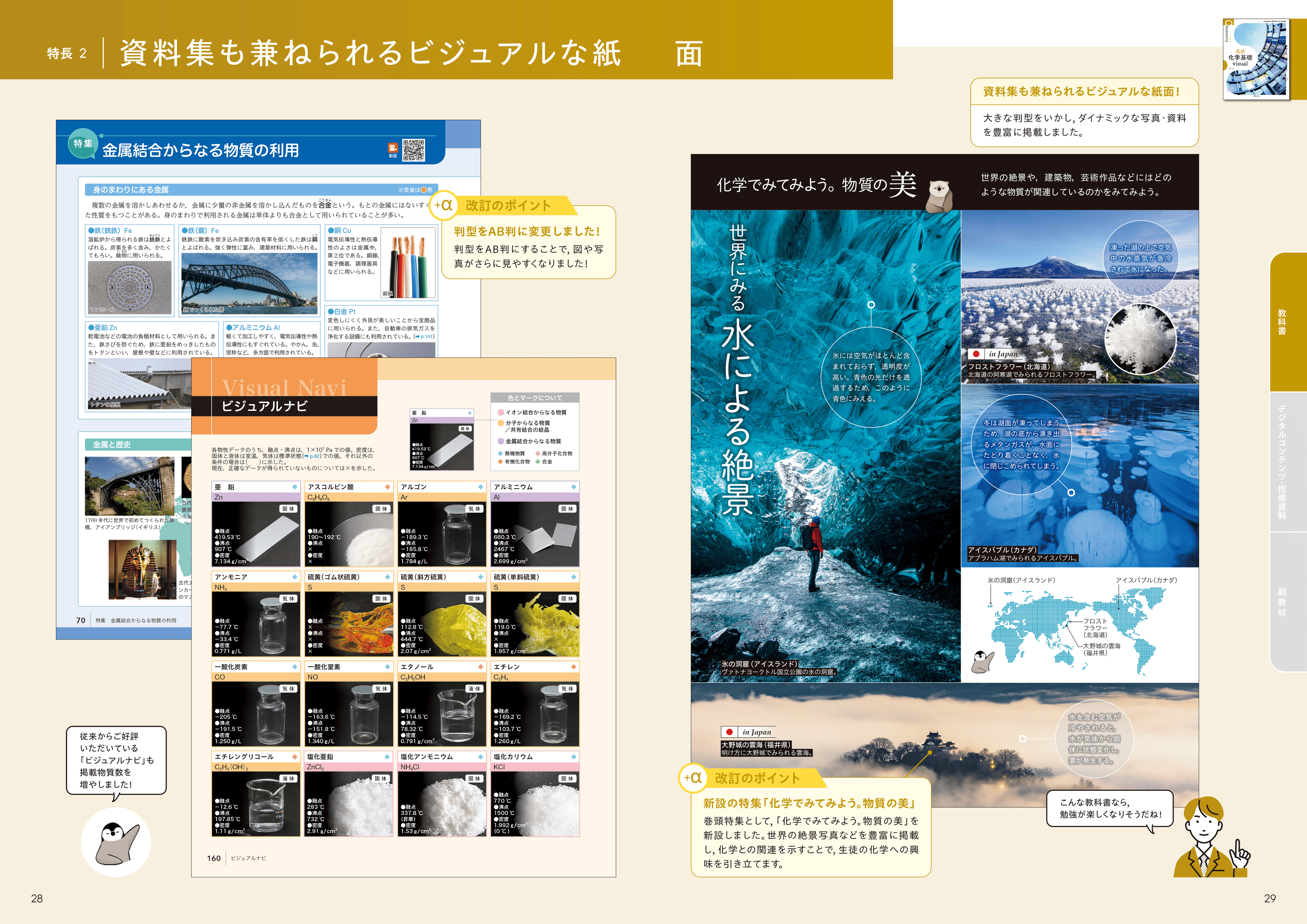 写真を豊富に掲載することで、生徒の興味・関心をひきだします。 従来からご好評いただいている「ビジュアルナビ」は掲載物質数を増やしました。