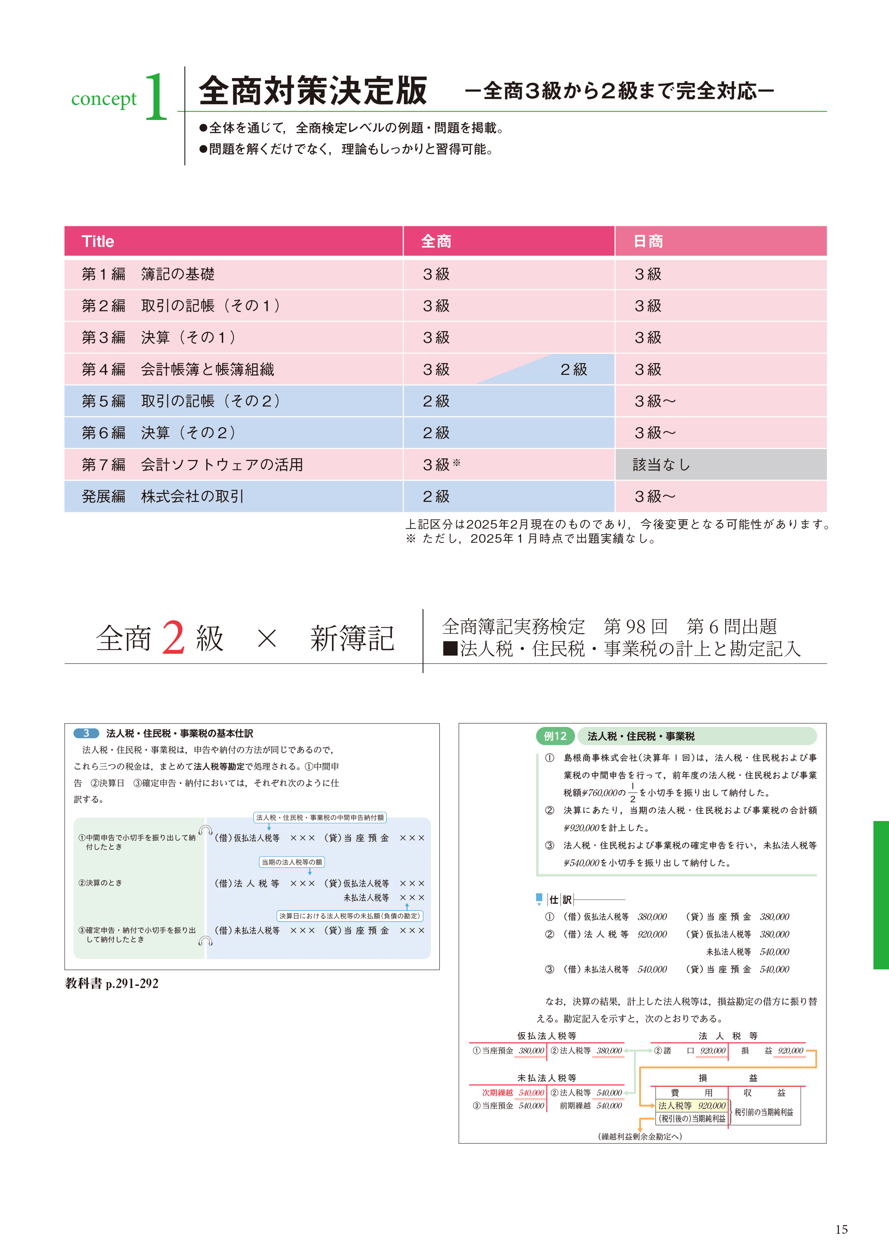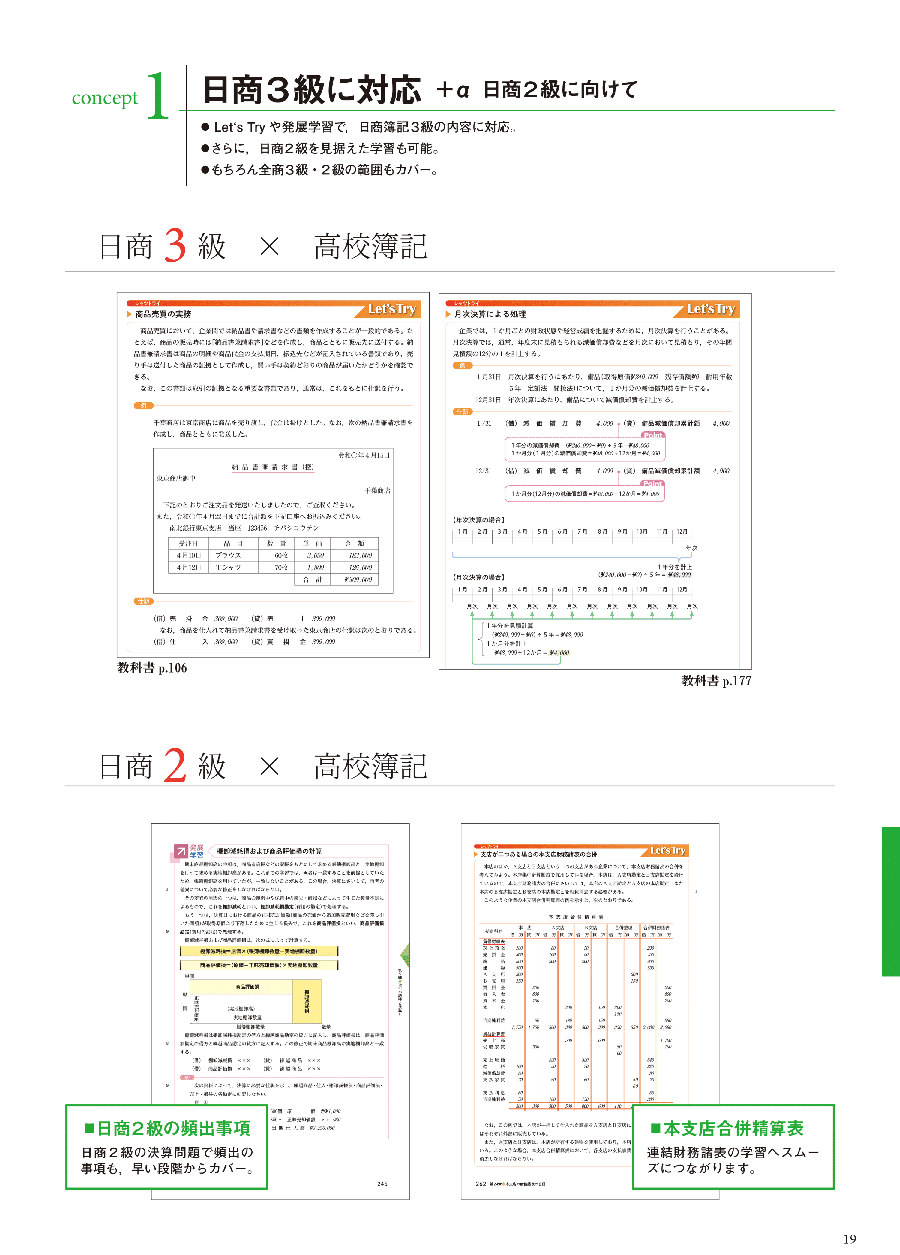 Let's Try や発展学習で日商簿記3級の内容に対応しています。全商簿記検定3級・2級の範囲もカバー。さらに日商簿記2級を見据えた学習も可能です。