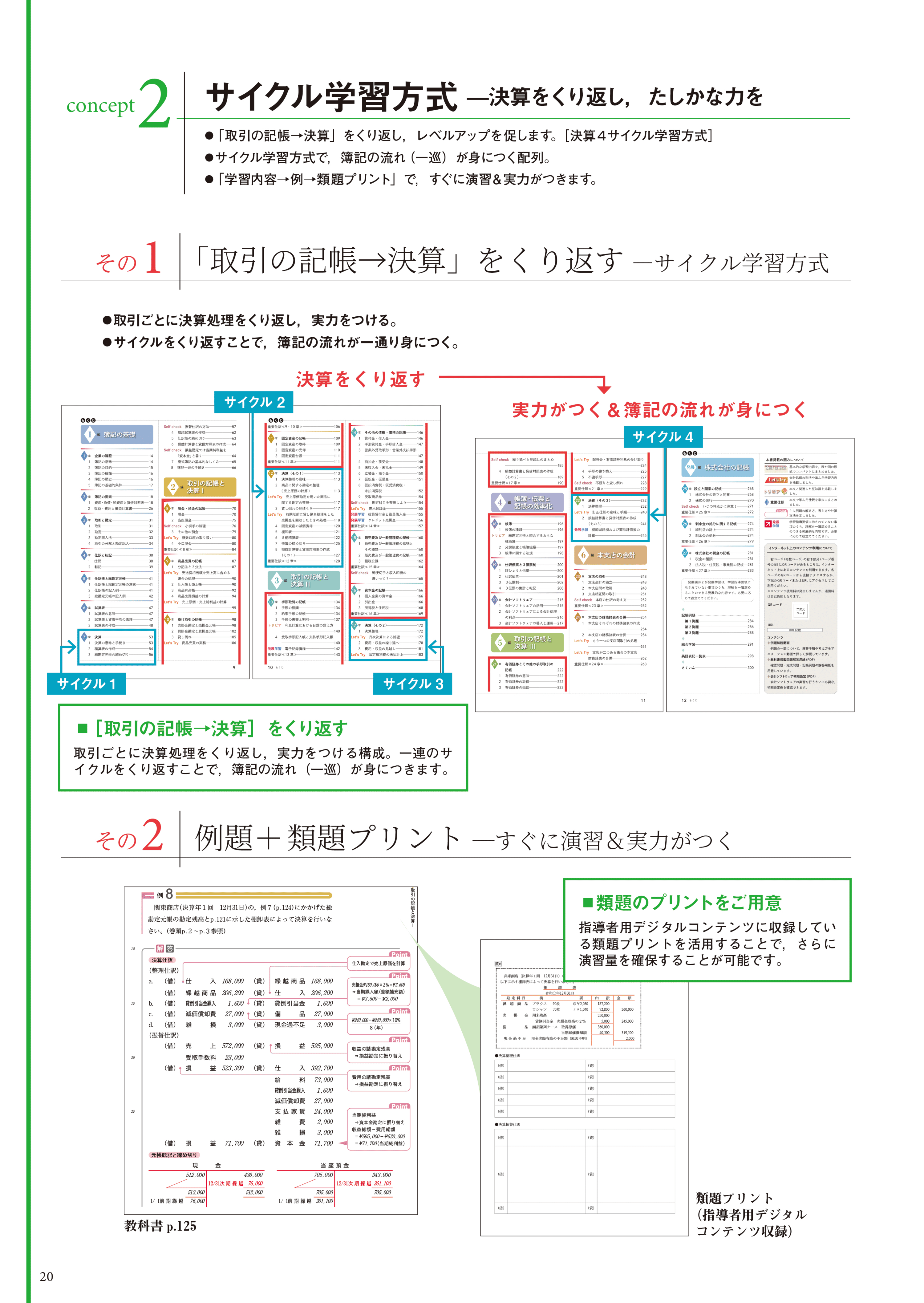 「取引の記帳→決算」をくり返し、レベルアップを促す「決算4サイクル学習方式」。