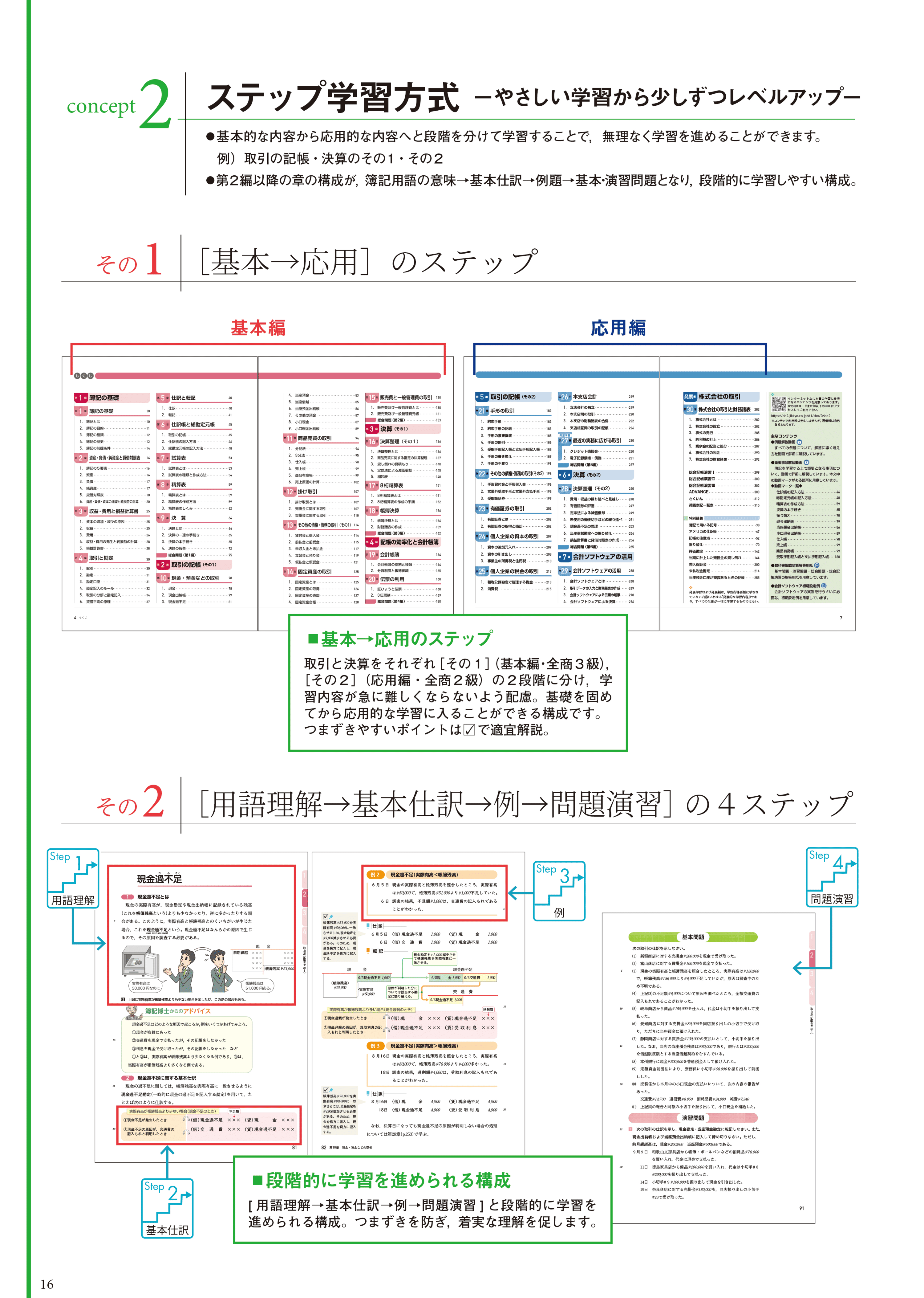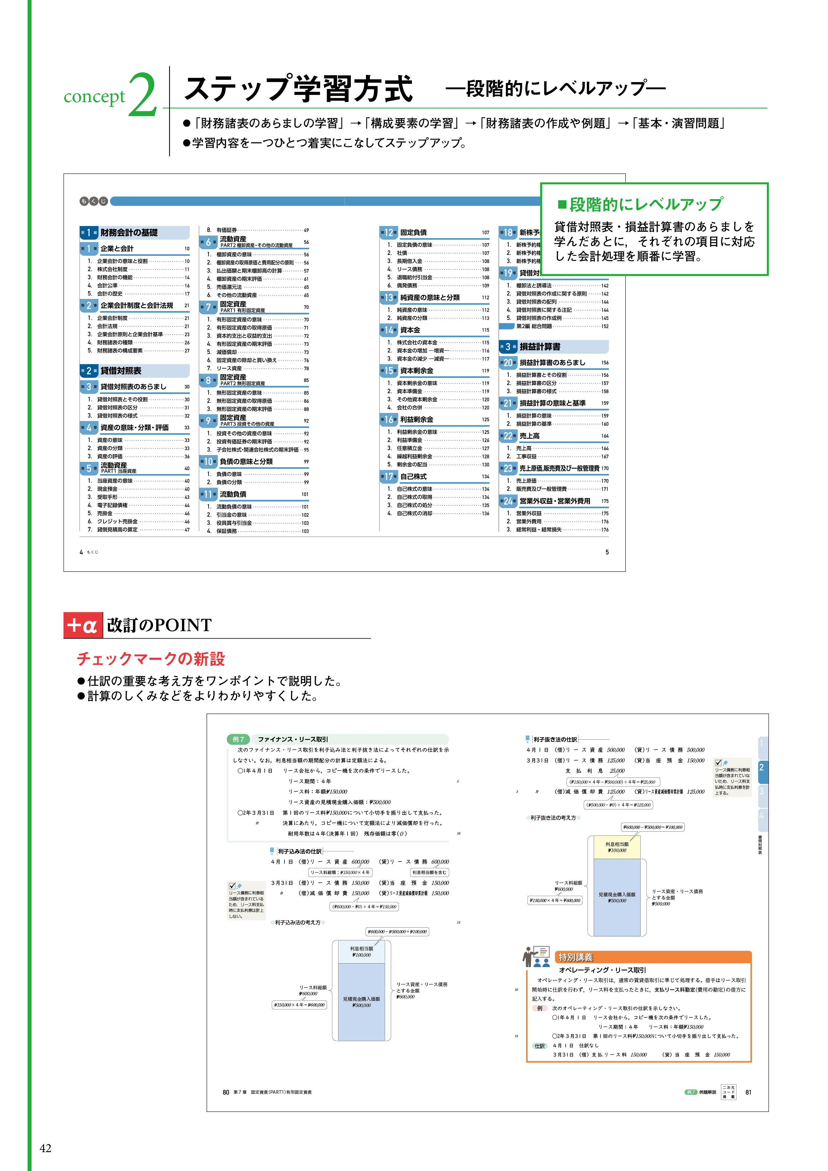 -段階的にレベルアップ-「財務諸表のあらましの学習」→「構成要素の学習」→「財務諸表の作成や例題」→「基本・演習問題」。学習内容を一つひとつ着実にこなしてステップアップ