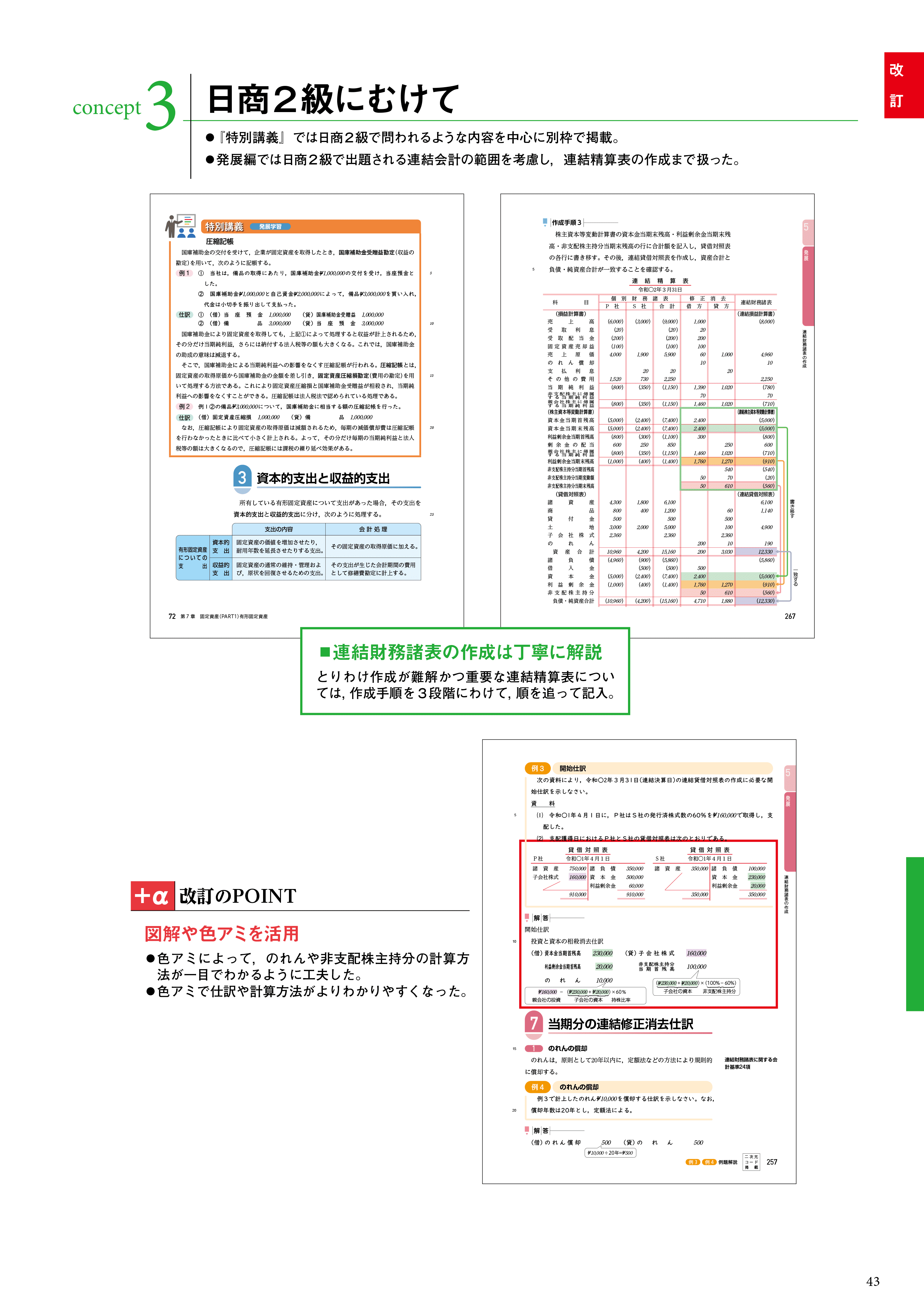 『特別講義』では日商2級で問われるような内容を中心に別枠で掲載。発展編では日商2級で出題される連結会計の範囲を考慮し、連結精算表の作成なで扱った。