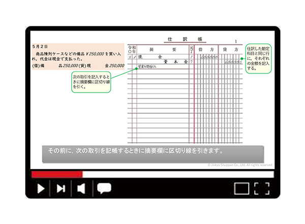 簿記を学ぶうえで大事な考え方や帳簿の記入方法を中心に解説をしています。とくに帳簿の記入方法では、線の引き方ひとつまで、細かく、丁寧に解説しています。視聴することで、簿記に対する理解を高めることができます。